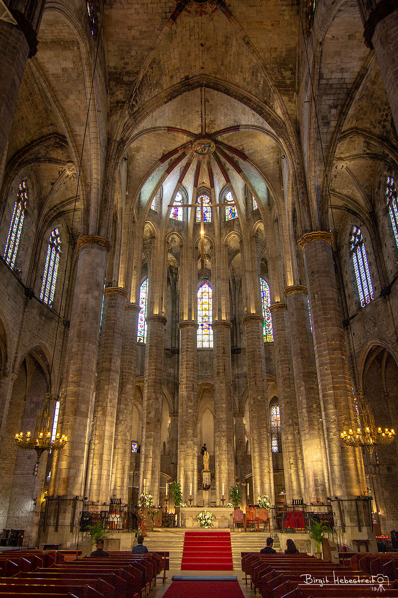 Die gotische Kirche Santa Maria del Mar wurde zwischen 1329 und 1383 erbaut, also zur Blütezeit der katalanischen Vorherrschaft im Handel und zur See. Sie ist ein herausragendes Beispiel katalanischer Gotik, mit einer Reinheit und Einheitlichkeit des Stils, die für große mittelalterliche Gebäude sonst unüblich ist. |
