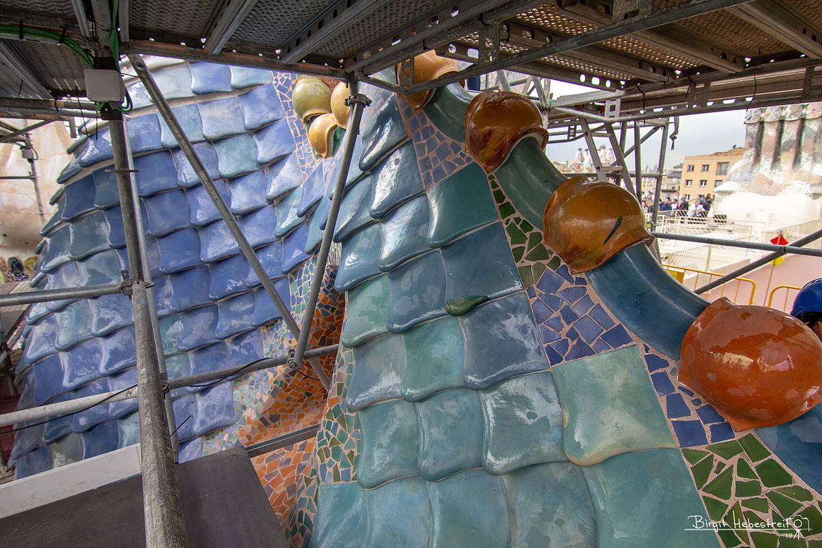 Leider wird diese wunderschöne Fassade derzeit restauriert, sodass wir sie nicht bewundern können. Dafür können wir aber in Zuge der Bauarbeiten das Dach besichtigen und über ein Gerüst direkt zu den Drachenhaut darstellenden Dachziegeln steigen. Natürlich nur nach Unterzeichnung eines entsprechenden Dokumentes, mit dem wir auf Klagen verzichten, falls uns etwas auf den Kopf oder wir herunterfallen. Zumindest hofften wir, dass dies der Inhalt des Dokumentes war und keine Abtretung unseres Vermögens an den spanischen Staat ;-)