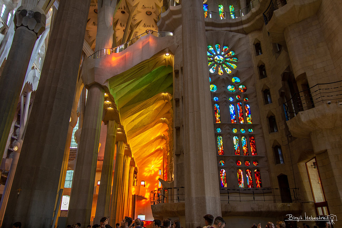 Wir sind begeistert von der Kirche. Vor allem von der Freundlichkeit, die die Kirche durch ihre Architektur und ihr einfallendes Licht ausstrahlt. Wir haben unsere Besuchszeit richtig gewählt. Vormittags scheint die Sonne durch die Fenster, deren Glas in Gelb-Grün-Blau-Tönen gehalten sind - am Nachmittag durch die Fenster in den Gelb-Orange-Rot-Tönen. Das Innere der Kirche wird dadurch in ein Farbenspiel dieser warmen Farben getaucht - was unbeschreiblich schön ist. Auch die Säulen und das an ein Blumen- und Blätterdach erinernde Deckengewölbe - wunderschön.
