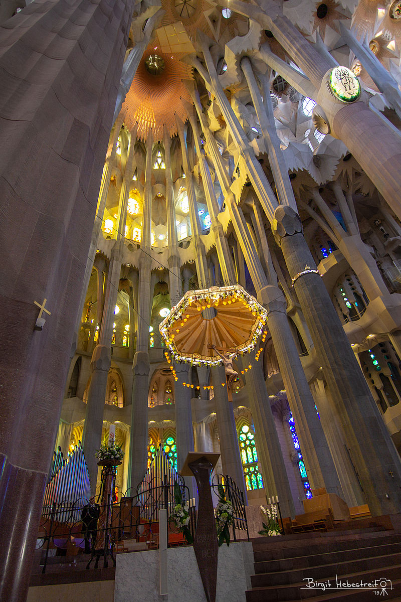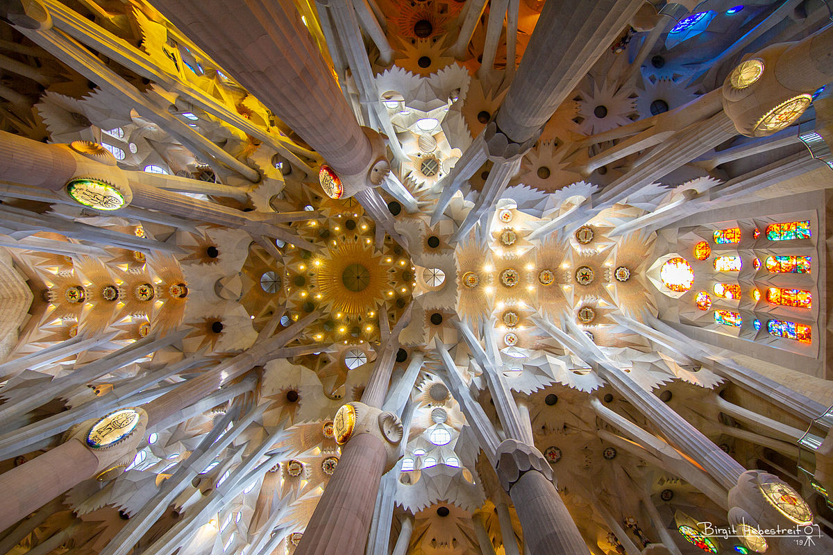 Die von Antoni Gaudi im Stil des Modernisme entworfene Sagrada Familia (oder auch Heilige Kathedrale) ist zu recht die Top-Sehenswürdigkeit von Barcelona. Die unvollendete Kirche, an der Gaudi bis zu seinem Tod gearbeitet hat, wurde 1882 begonnen und soll 2026 zum 100. Todestag von Gaudí fertiggestellt sein. Dann soll auch der 172,5m hohe Hauptturm fertig gestellt sein. Da Gaudi die Natur als Lehrmeister ansah, finden wir viele architektonische Teile an die Natur angelehnt. So sind die Säulen Baumstämmen nachempfunden, die sich an ihren oberen Enden in Äste aufteilen. Darüber ist ein Blätterdach angedeutet. Viel Licht srömt durch die bunten Glasfenster ins Innere der Kirche, das 2010 fertiggestellt wurde. Als Gaudi die Baustelle übernahm, war die Krypta schon im Stil der Neogotik begonnen, er leistete die Hauptarbeit im Stil des Modernisme, heute sind auch viele Einflüsse der Moderne sichtbar. Der Unterschied fällt vor allem außen an den unterschiedlich gestalteten Schau-Fassaden auf. |