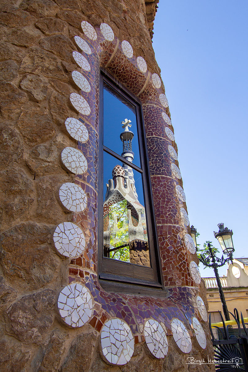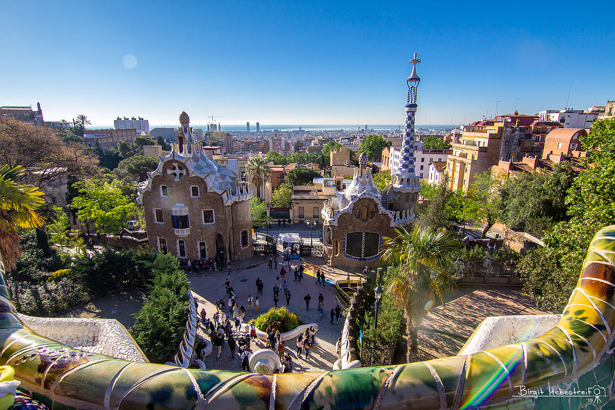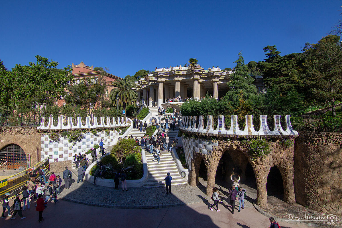 Der Park Güell wurde von Antoni Gaudí in den Jahren 1900 bis 1914 erschaffen. Der Park war eine Auftragsarbeit für den Industriellen Eusebi Güell und sollte ein stilvoller Park für die Aristokratie von Barcelona werden. Antoni Gaudí plante eine Gartenstadt mit über 60 Villen. Da nur zwei Villen verkauft wurden, scheiterte das Vorhaben. Es wurden nur drei Häuser gebaut: das Wohnhaus der Familie Güell, das Wohnhaus Gaudís (heute ein Museum) und das noch heute bewohnte Wohnhaus eines befreundeten Architekten. Gaudi verzichtete auf große Erdbewegungen und passte seine Pläne dem hügeligen Terrain an. Dabei wurden Stützmauern und Terrassen verwendet, die sich durch ihre organischen Formen einzigartig ins Gelände einpassen. Zwei Pförtnerhäuser mit markanten „Zuckergussdächern“ markieren den Eingangsbereich. Eine große Freitreppe führt zum Terrassenplatz, dem Treffpunkt für Besucher, Musiker und Maler. |