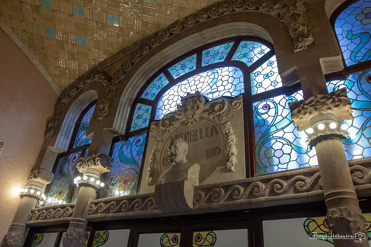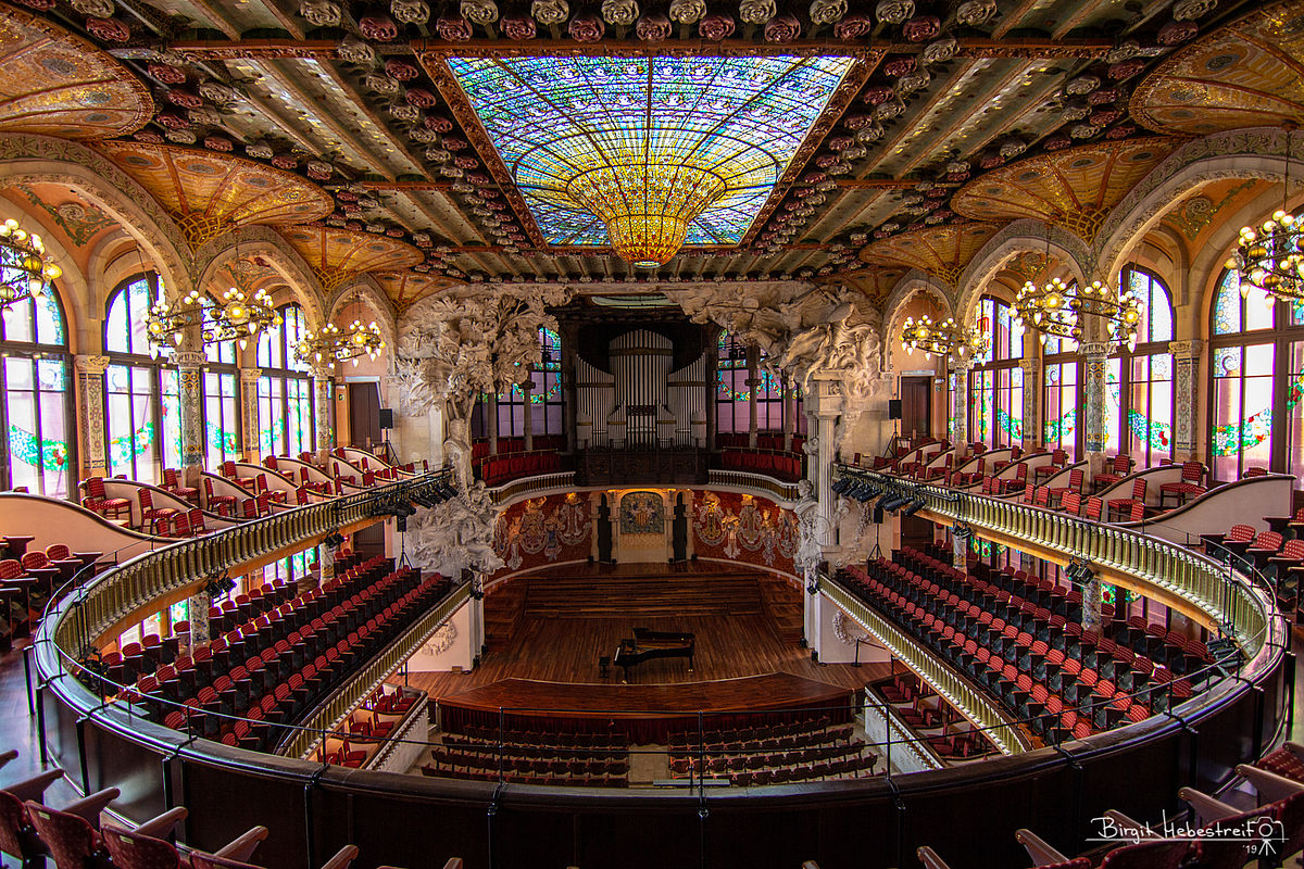 Das Palau de la Música Catalana ist ein wunderschöner Konzertsaal in Barcelona. Er wurde vom Architekten Lluís Domènech i Montaner, einem der wichtigsten Repräsentanten des Modernisme, geplant und entworfen. Der Bau dauerte von 1905 bis 1908. Ungewöhnlich für Konzertsäle wurden hier auch im Inneren Materielien wie Glas und Keramik verbaut. Markant ist das Buntglas-Dachlicht. Ursprünglich nur für Chormusik geplant, werden heute nach Anpassungen in der Akustik alle Musikstile bedient. Nur Opern werden aus Platzgründen nicht aufgeführt. |