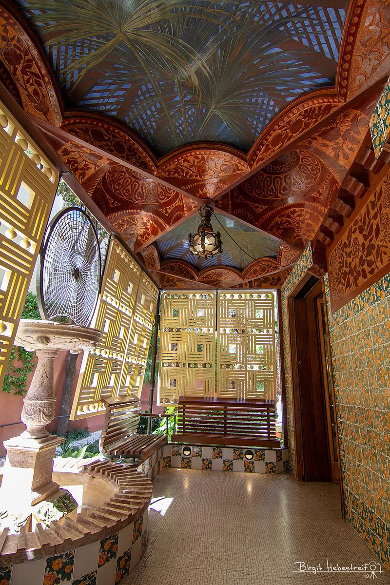 Schon von außen fällt die bunte Mosaik-Fassade auf. Die Fassade ist feingliedrig und sieht fast aus, wie aus kleinen Bausteinen zusammengesetzt. Auf der Dachterrasse finden wir mehrere kleinen Türmchen und schmiedeeiserne Zäune. Im Raucherzimmer gibt es ein tropfsteinhöhlenartiges Gewölbe, andere Räume haben Decken mit floralen Motiven. Die Veranda ist verschattet, aber so gebaut, dass immer ein Luftzug zu spüren sein muss. Man kann die Verschattungen natürlich auch wegklappen. Klasse! Wieder einmal der Gedanke: "So ein Haus würde ich auch nehmen!"