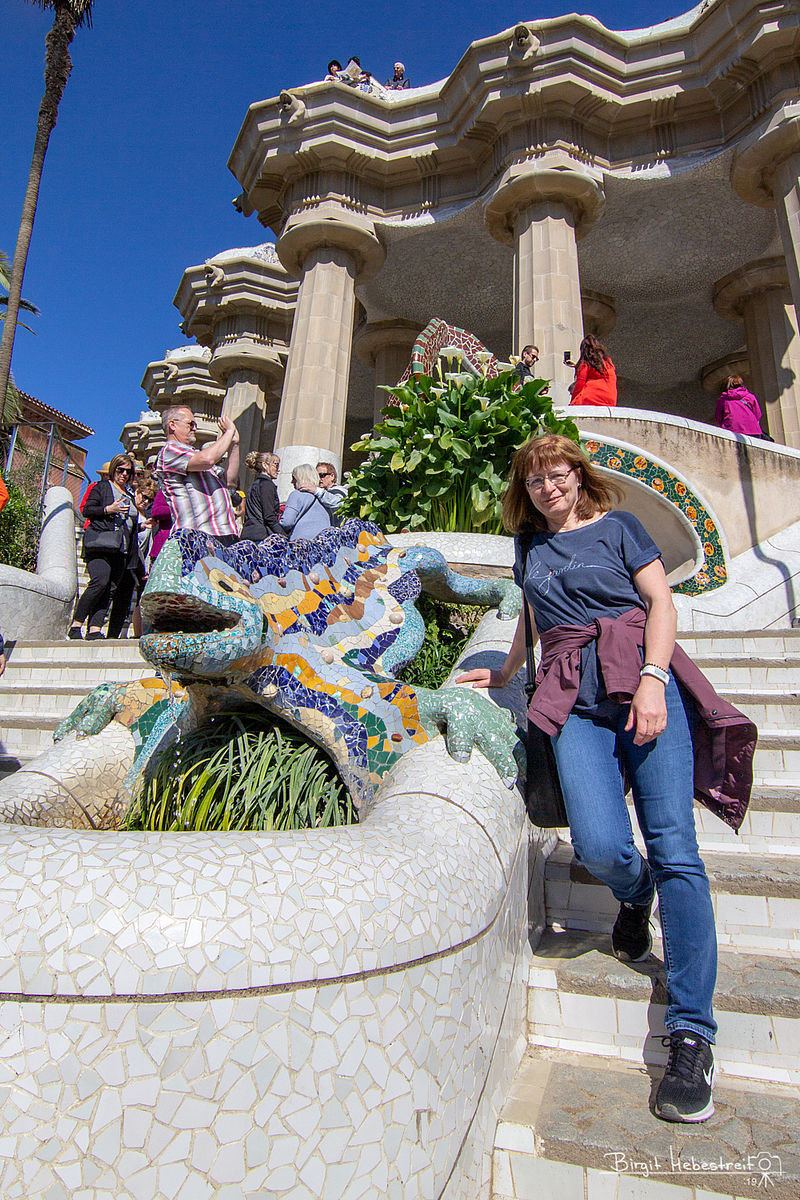 Wir betreten das Parkzentrum, das jeder von Bildern kennt von oben und kommen auf der Terrasse an. Diese wird von wunderschönen geschwungenen Bänken mit Keramikscherben umzogen. Keine Stelle ist genauso gefliest wie die andere. Phantasievoll, bunt. Auf dem Weg die Freitreppe hinunter kommen wir am kleinen Drachen vorbei, den wohl jeder von Fotos kennt. Die Pförtnerhäuschen kann man besichtigen. Das Wohnhaus des Pförtners ist drinnen wesentlich geräumiger, als man es von außen vermutet.