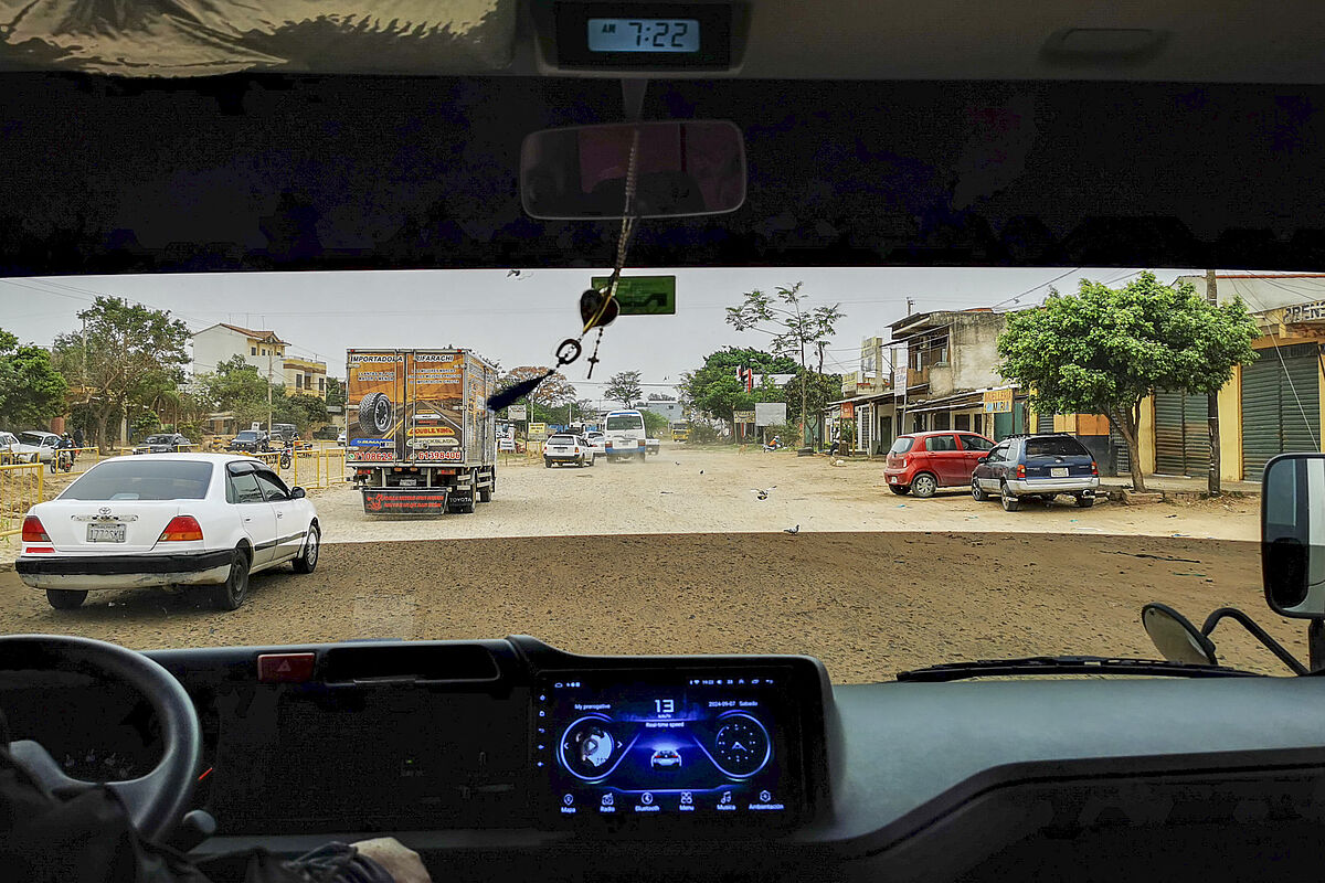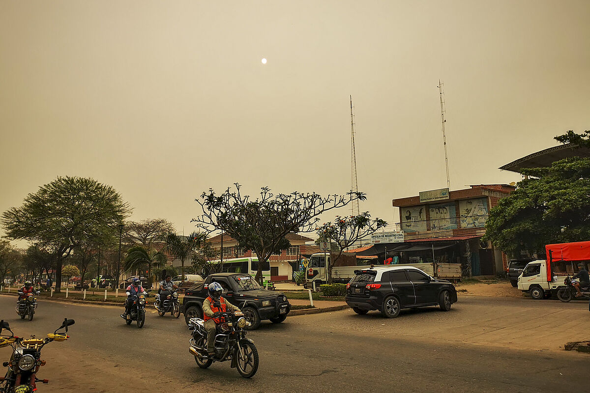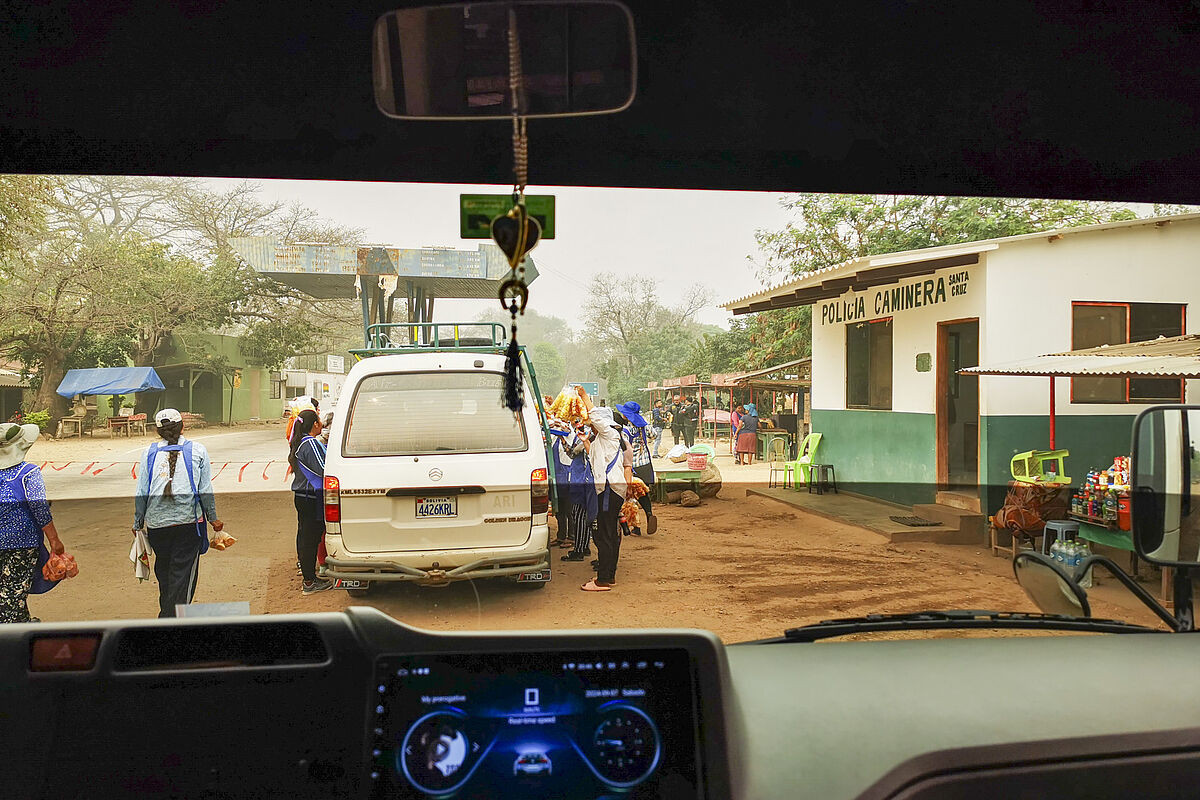 Fast eine Stunde dauert unsere Fahrt durch Santa Cruz. Zwischendurch halten wir mal an, kaufen die ersten Wasserflaschen und machen uns ein Bild von der Gegend. Mein erster Eindruck ist: trocken und staubig. Ausgetrocknete Flussläufe und diesiger Himmel. Wir erfahren, warum der Dunst die Sonne verdunkelt. Waldbrände. Überall in der Gegend und in Südamerika lodern Waldbrände. Der Dunst zieht aktuell sogar bis Buenos Aires.
