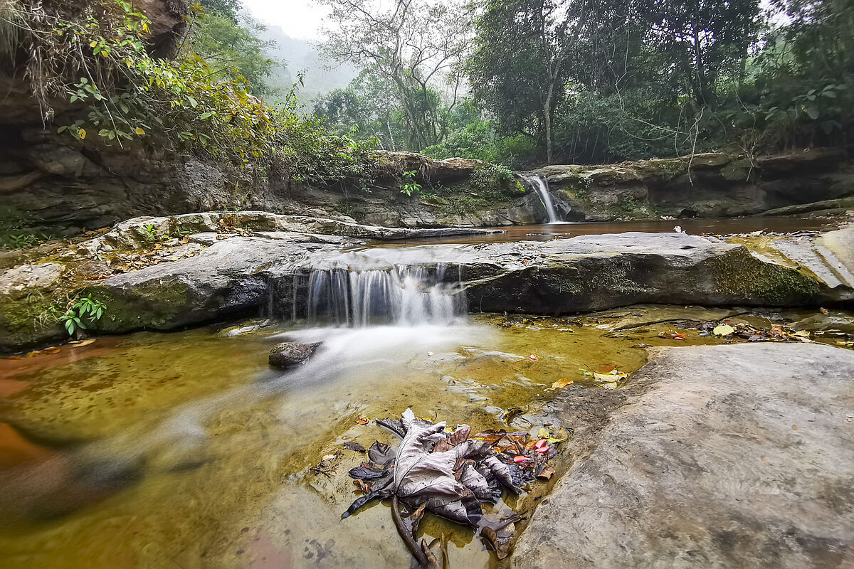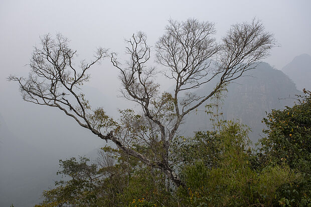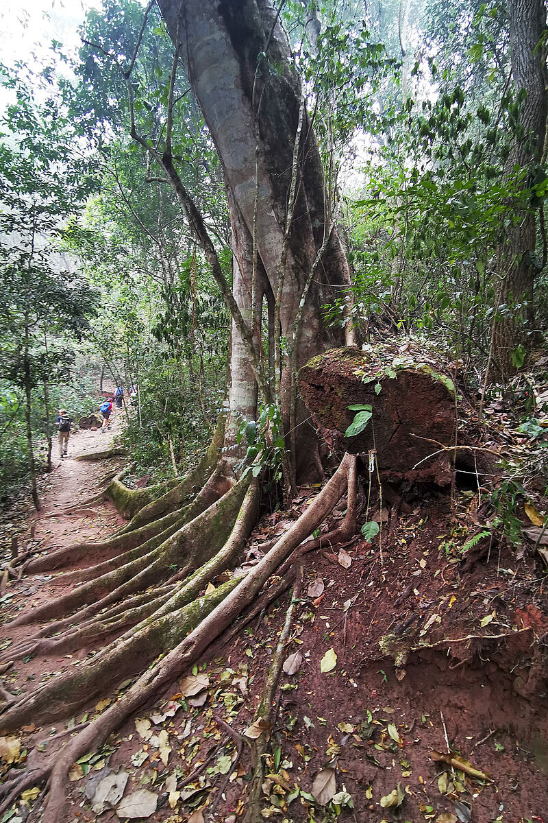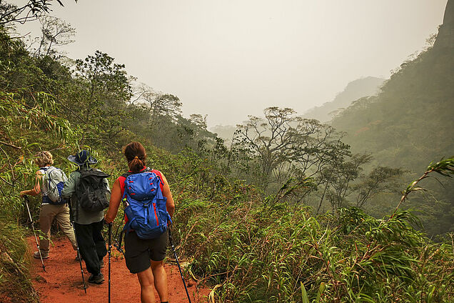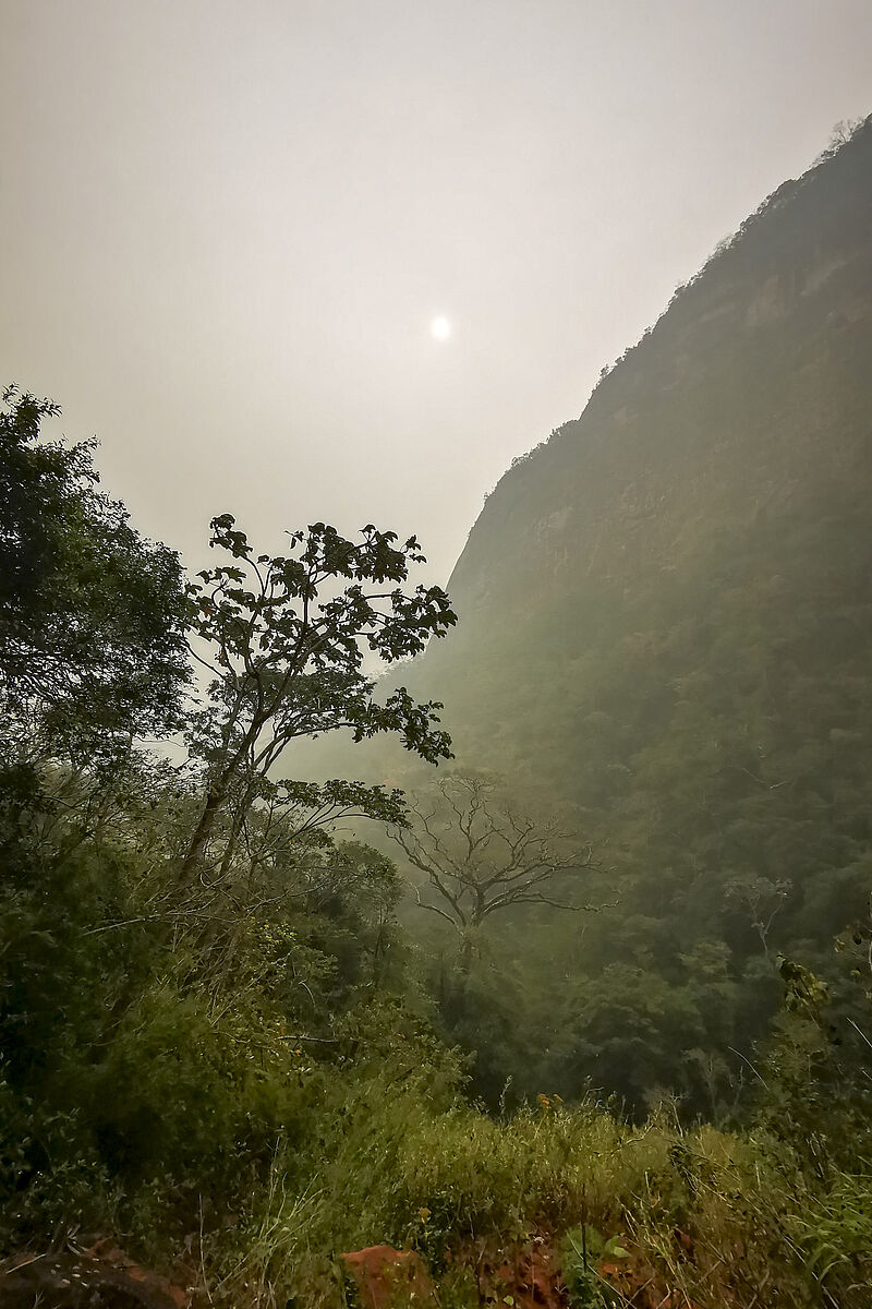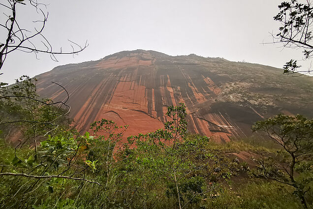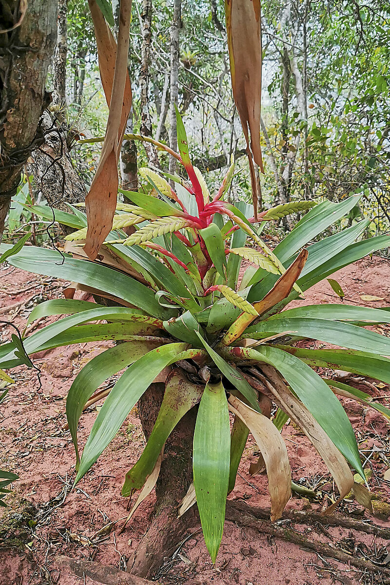 Wir laufen entlang einer schönen roten Felswand, die mit Bromelien gespickt ist. Dann kommen wir zu zwei Aussichtspunkten, von denen wir aber leider wegen des Smogs keine Aussicht haben. Dabei hatte ich mich so auf die charakteristischen Bergformen des Amboro-Nationalparks gefreut.
