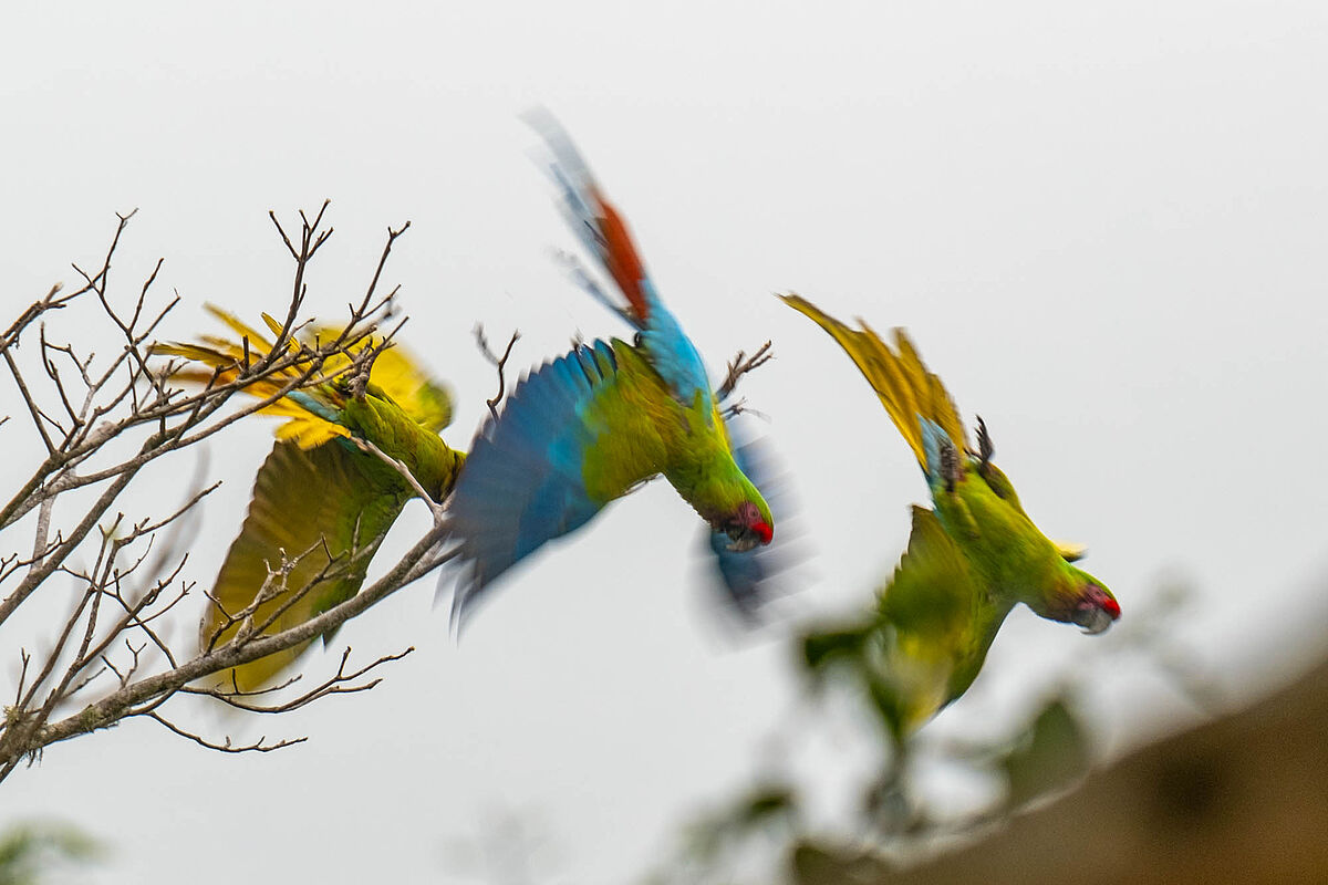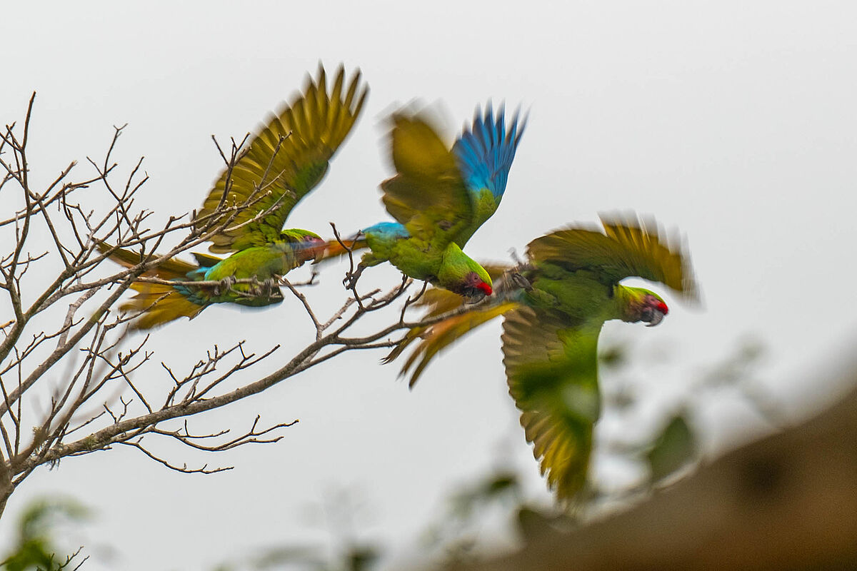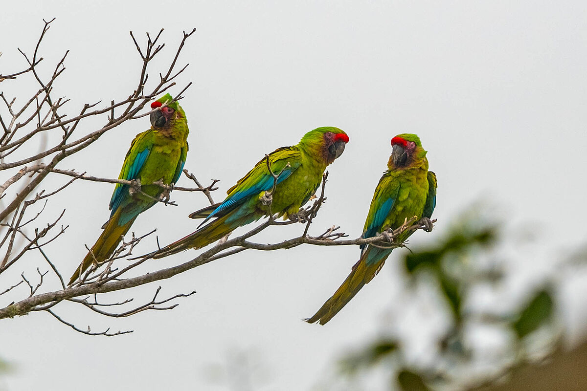 Auf dem Weg zurück nach unten entdecken wir dann die Aras ganz nah – nur durch ein paar Büsche von uns getrennt auf einem abgestorbenen Baum. Foto-Time!!!