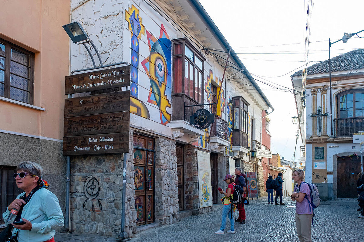 Wir laufen durch die sehr schöne, mit Kolonialbauten versehene Gasse Calle Jaen und stoßen auf die Galerie des bekannten Künstlers Mamani Mamani, der für seine farbenfrohen Bilder bekannt ist. Leider haben wir aber keine Zeit hineinzugehen.