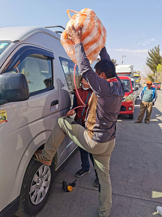 Bald müssen wir tanken. Allerdings gibt es an allen Tankstellen Probleme mit den Kassen. Deshalb wird erst mal der Reservekanister eingefüllt.