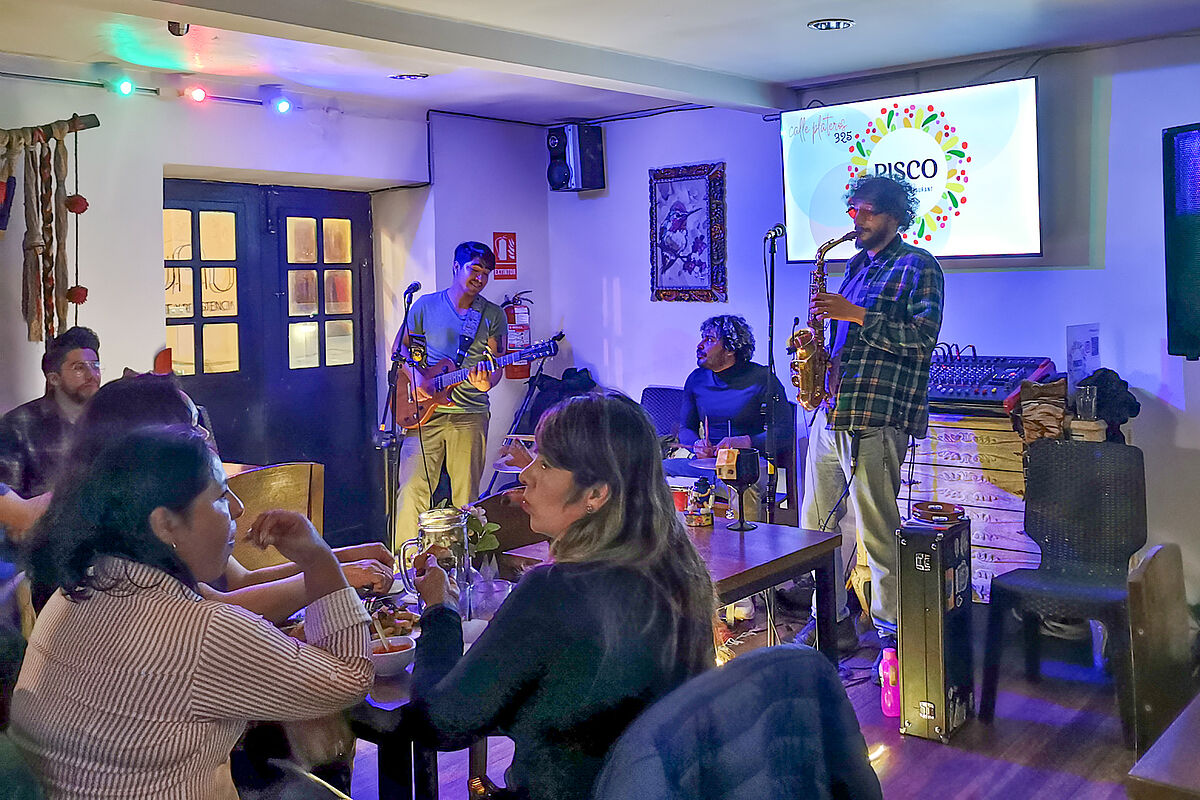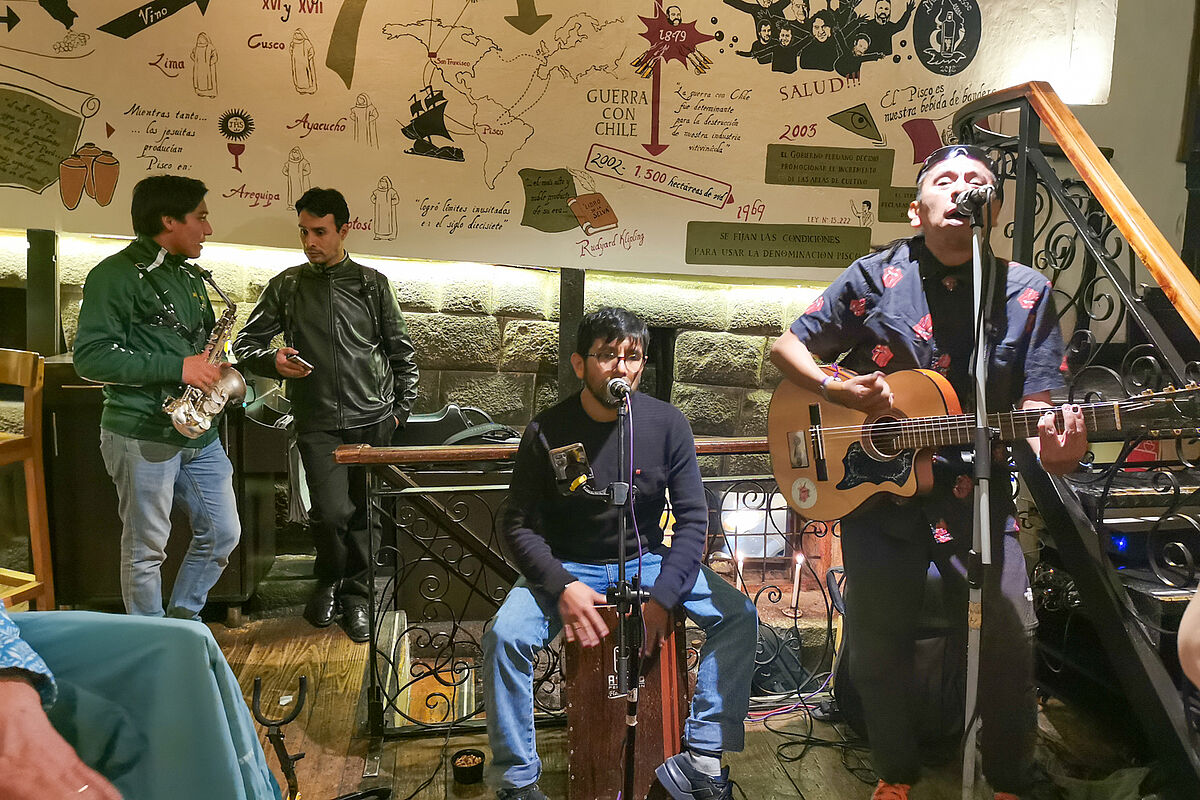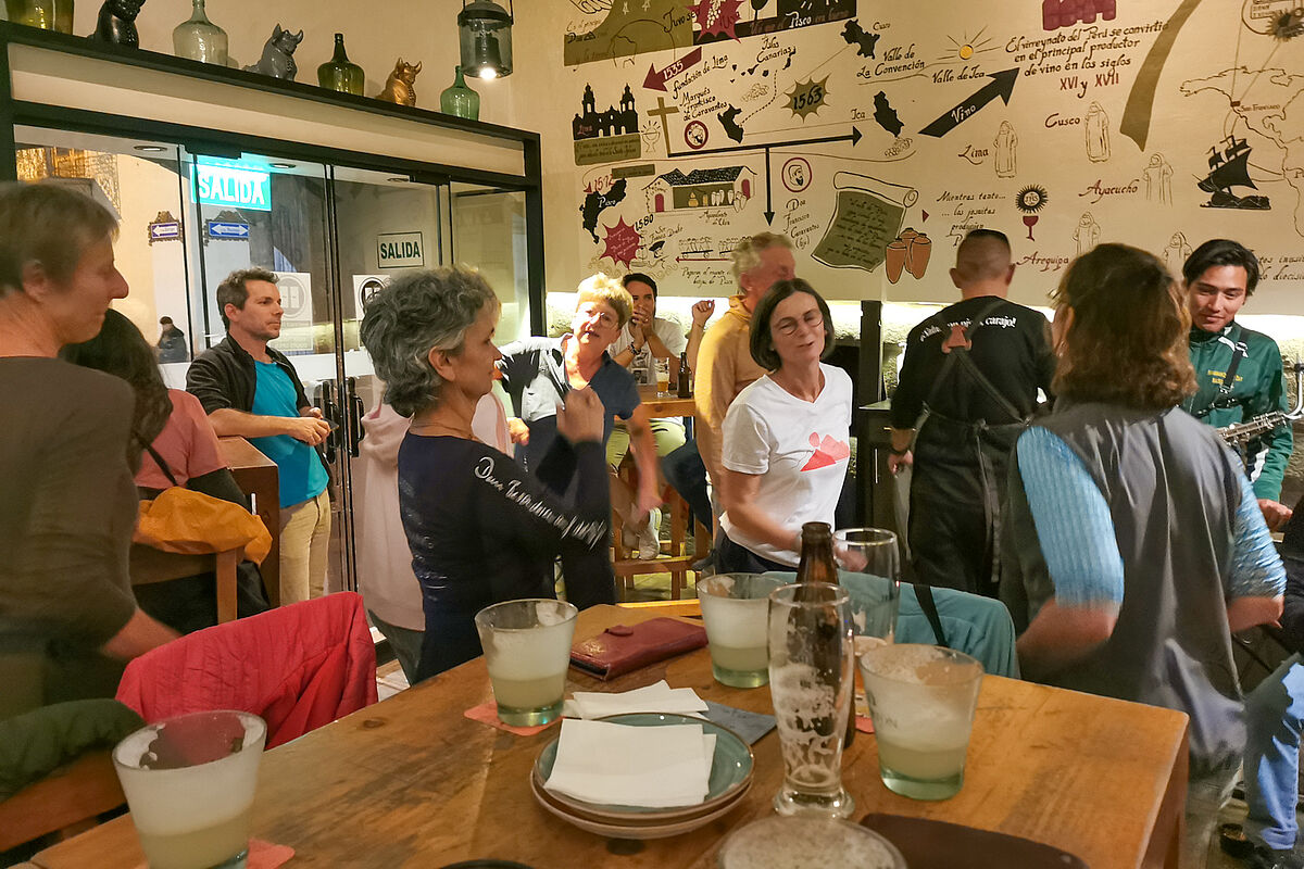 Inzwischen ist es dunkel, aber wir machen trotzdem noch einen Rundgang durch die Stadt. Halb neun sitzen wir dann in einer kleinen Bar, das "Museo del Pisco". Wir essen zu Abend. Ich probiere Cevice, das peruanische Nationalgericht. Wir trinken Pico Sour, hören der Indio-Livemusik zu und tanzen. Ein lustiger Abend!