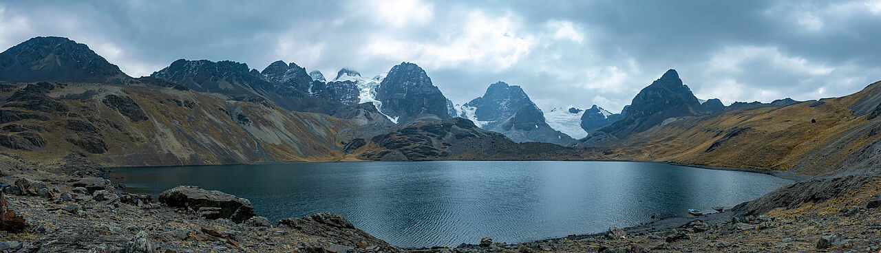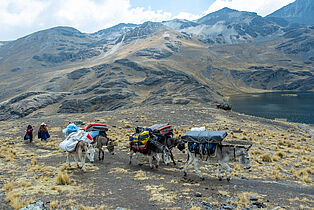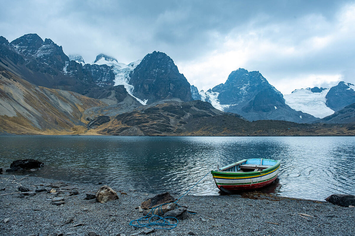 Wir laufen zur Laguna Chiar Khota, machen dort Rast, fotografieren am Boot und gehen noch bis zur nächst höheren Ebene. Wir sind jetzt auf 4700 m in einer wunderschönen Landschaft - mit Blick auf die Condoriri-Gletscher.