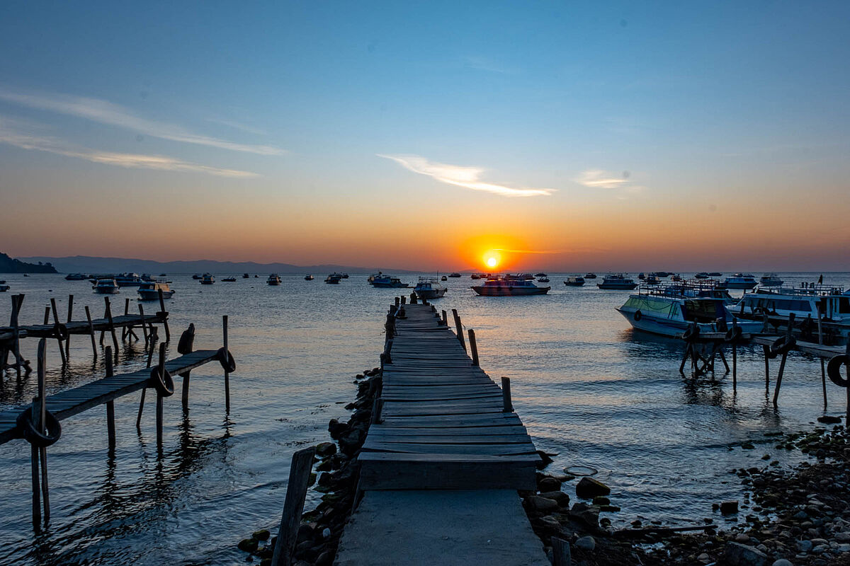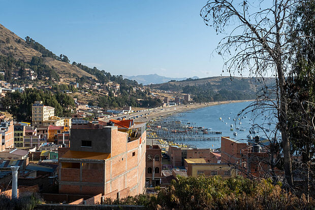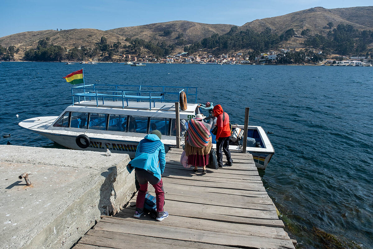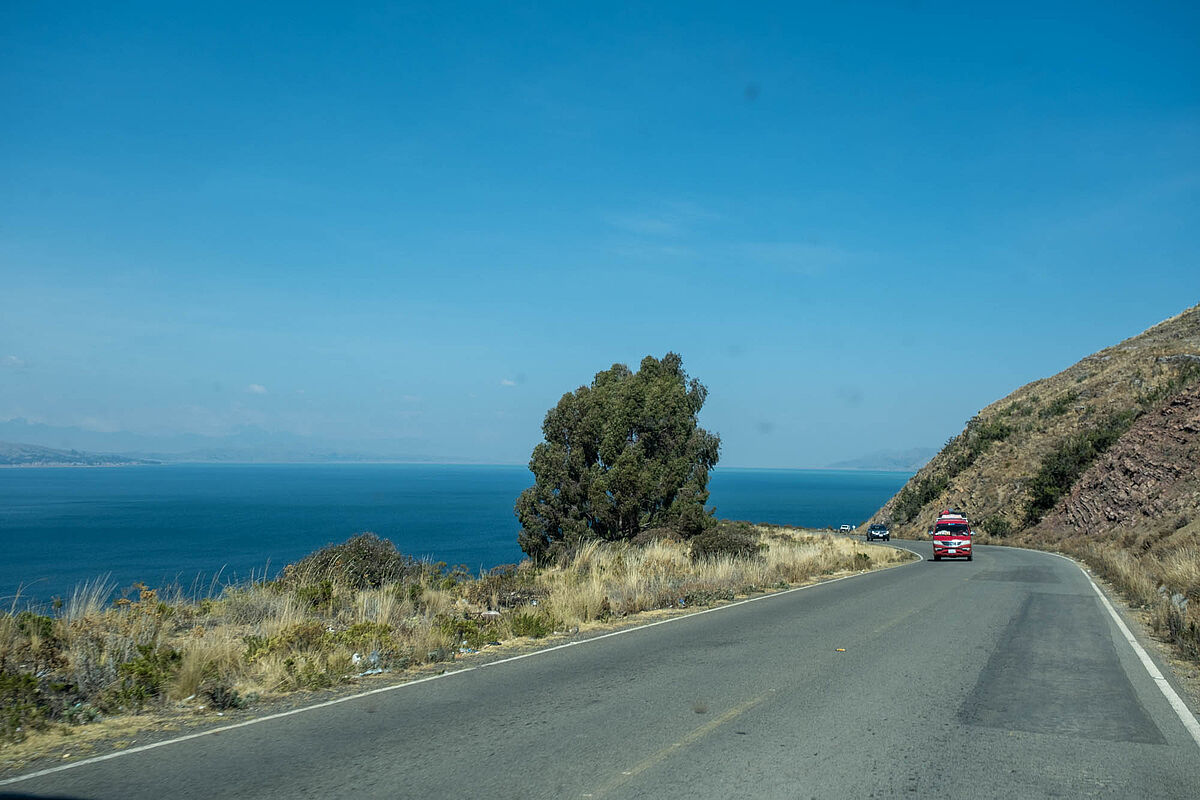 Wir fahren am Ufer entlang in Richtung Westen. In San Pablo de Tiquina überqueren wir den Titicacasee über die Straße von Tiquina.