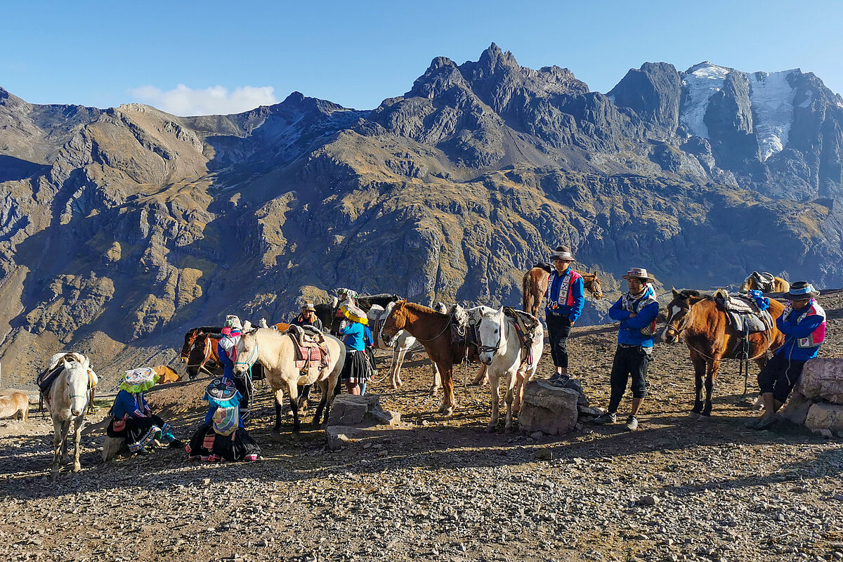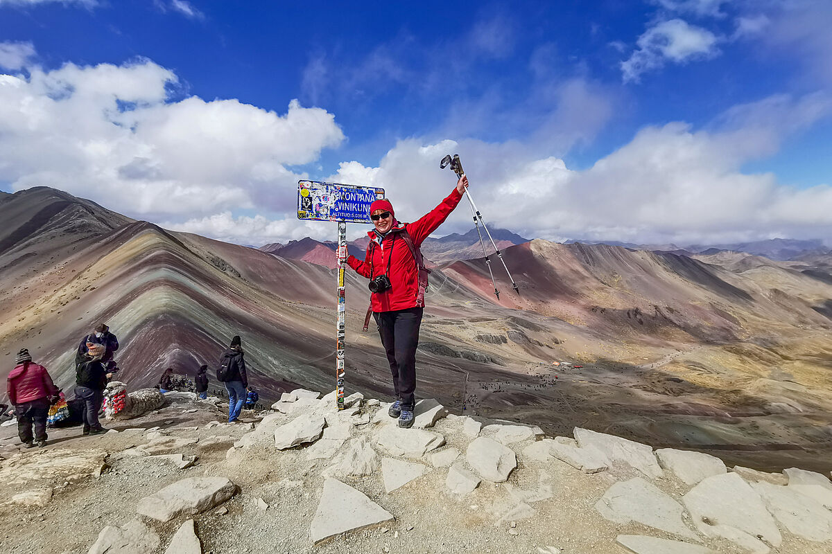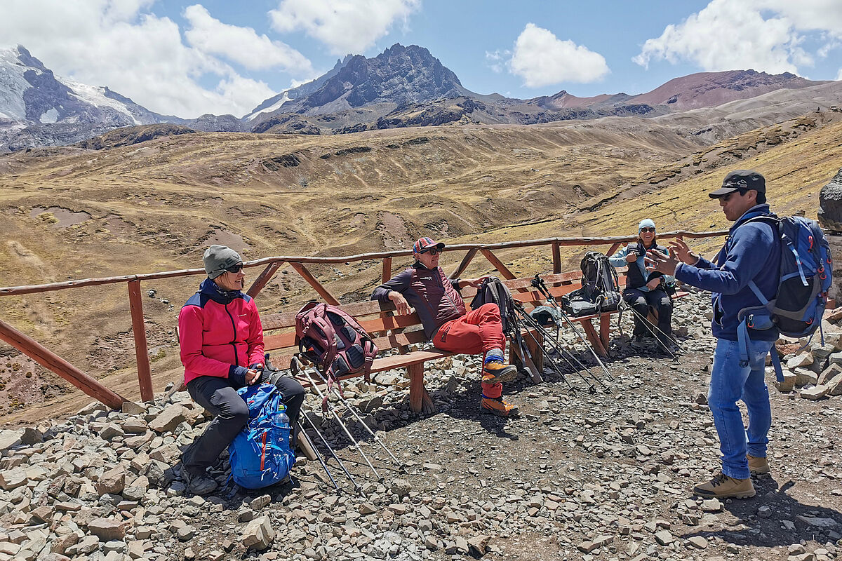 Obwohl es erst 9:00 Uhr ist, sind schon andere Leute hier. Wir machen am Aussichtspunkt auf 5036 m Höhe am Gipfel des Vinikunka viele Fotos. Im Tal auf der anderen Seite können wir auch auf die Gletscher sehen. Wir bleiben eine Stunde auf dem Gipfel. Dann machen wir uns auf den Rückweg.