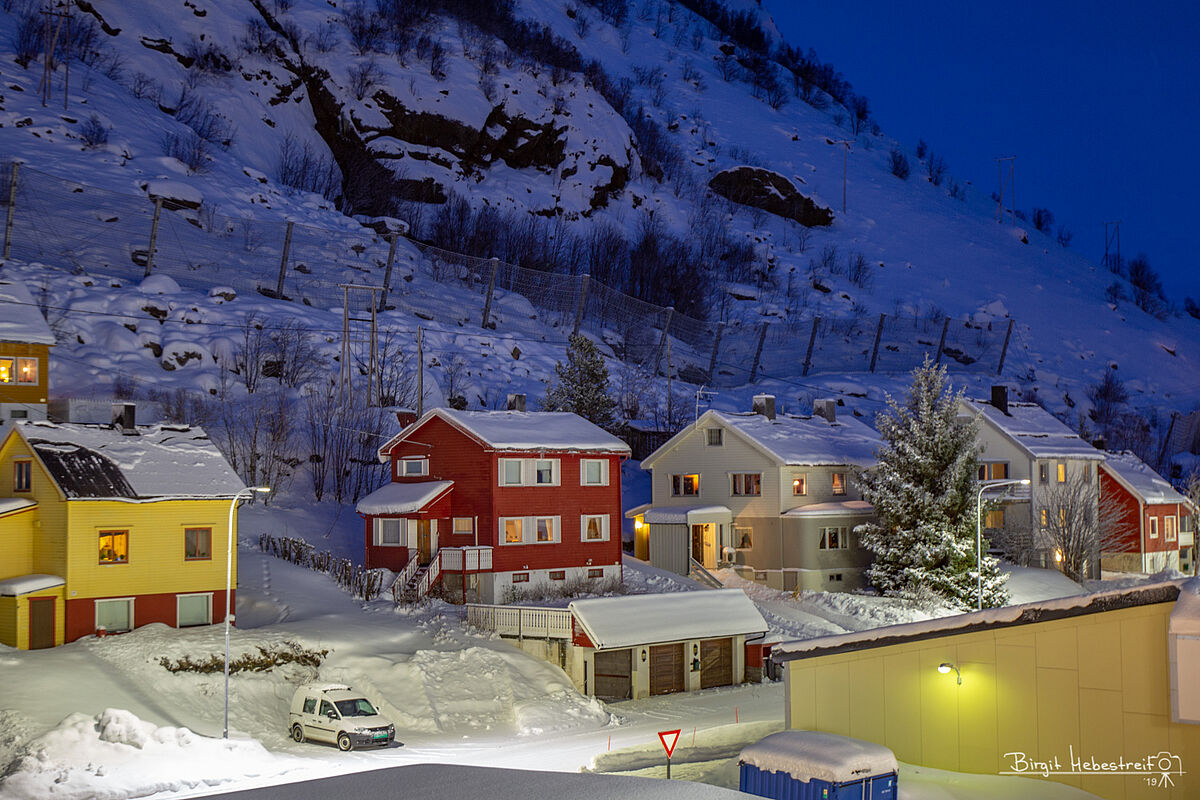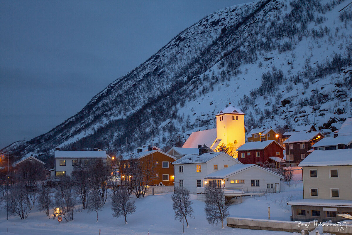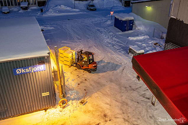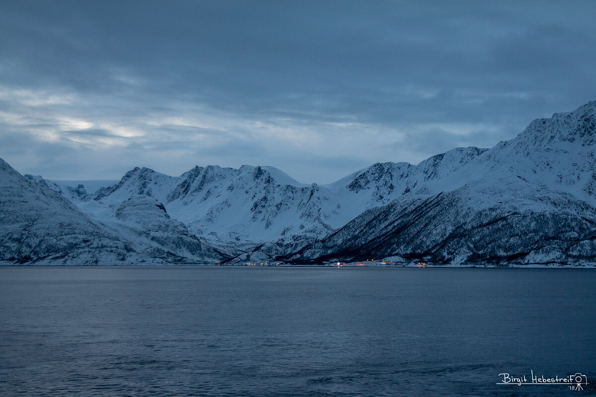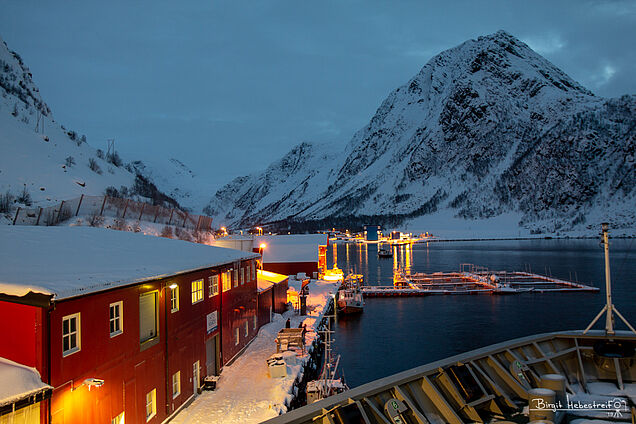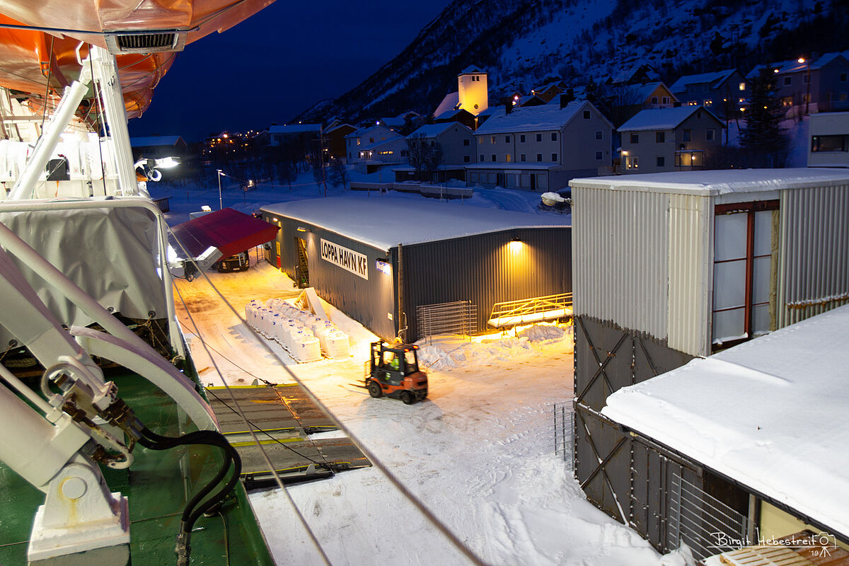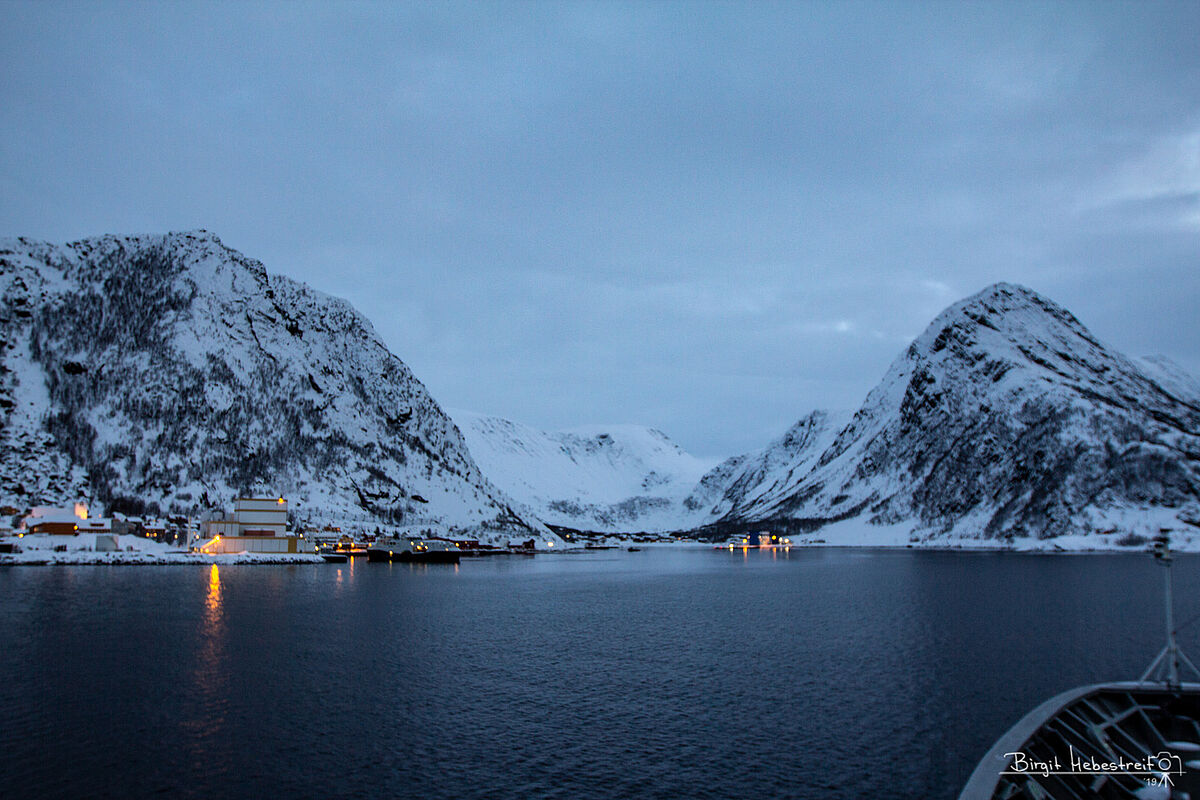 Nach Durchfahren des langen Soroysundets wird Oksfjord angefahren. Es ist schon ziemlich dunkel, so dass der steuerbordseitige Oksfjordjokelen mit der davor liegenden Siedlung nur schwer ins Bild kommt. Er kalbte früher als einziger Gletscher Norwegens direkt ins Meer. Aber die Zufahrt auf den Anlegeort ist auch bei diesen Lichtverhältnissen beeindruckend. Und im Hafen kann Birgit in der blauen Stunde permanent Aufnahmen vor allem vom Ladevorgang machen. Er erstreckt sich nämlich entgegen der Ansage „kurzer Aufenthalt“ auf fast eine Stunde, da der einzige Stapler von Oksfjord allein 22 Big Bags und viele Fischkästen in die Nordlys befördert.