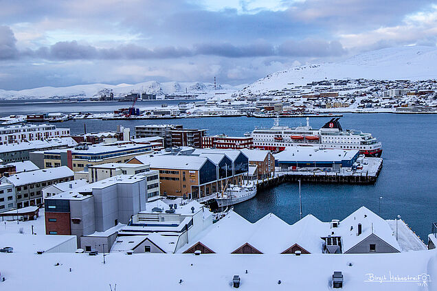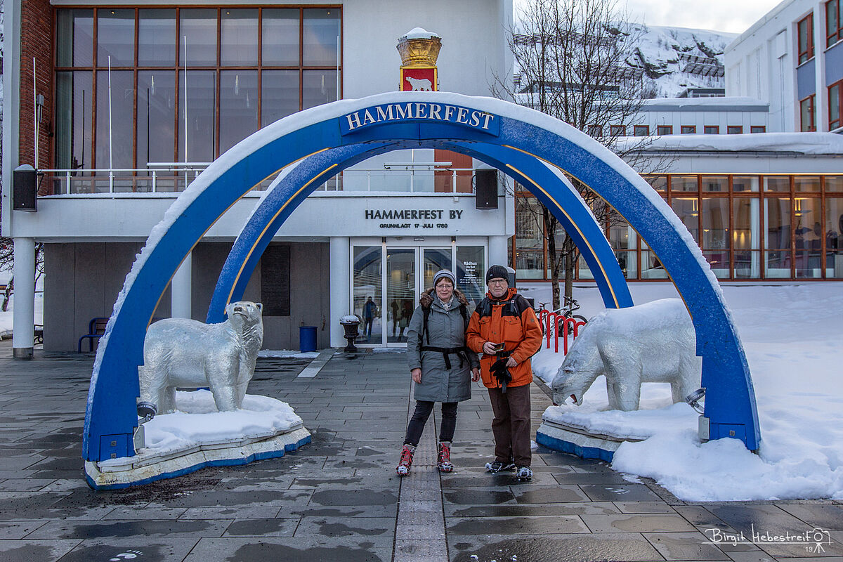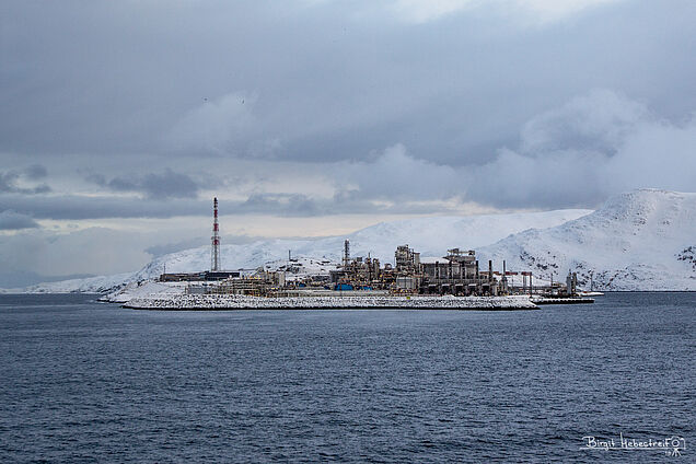 Zwischen 11 und 13 Uhr legt die Nordlys mit leichter Verspätung in Hammerfest an. Vor der Einfahrt liegt im Soroysundet die Flüssiggasanlage „Schneewittchen“ auf der Insel Melkoya, zu der Gas aus der gesamten Region in Leitungen unterhalb des Meeresbodens geleitet wird. Der Hurtigrutenkai liegt direkt am Zentrum der nördlichsten Stadt der Welt, so dass man kurze Wege zu den Sehenswürdigkeiten hat. Ausnahme ist das eindrucksvolle Monument des Meridianbogens (vor Jahren besichtigt), zu Fuß zu erreichen vom Kai der anderen Kreuzfahrschiffe auf der gegenüberliegenden Nordseite des Sunds.