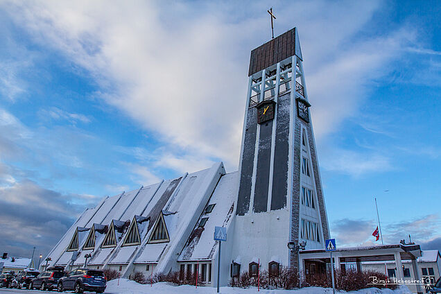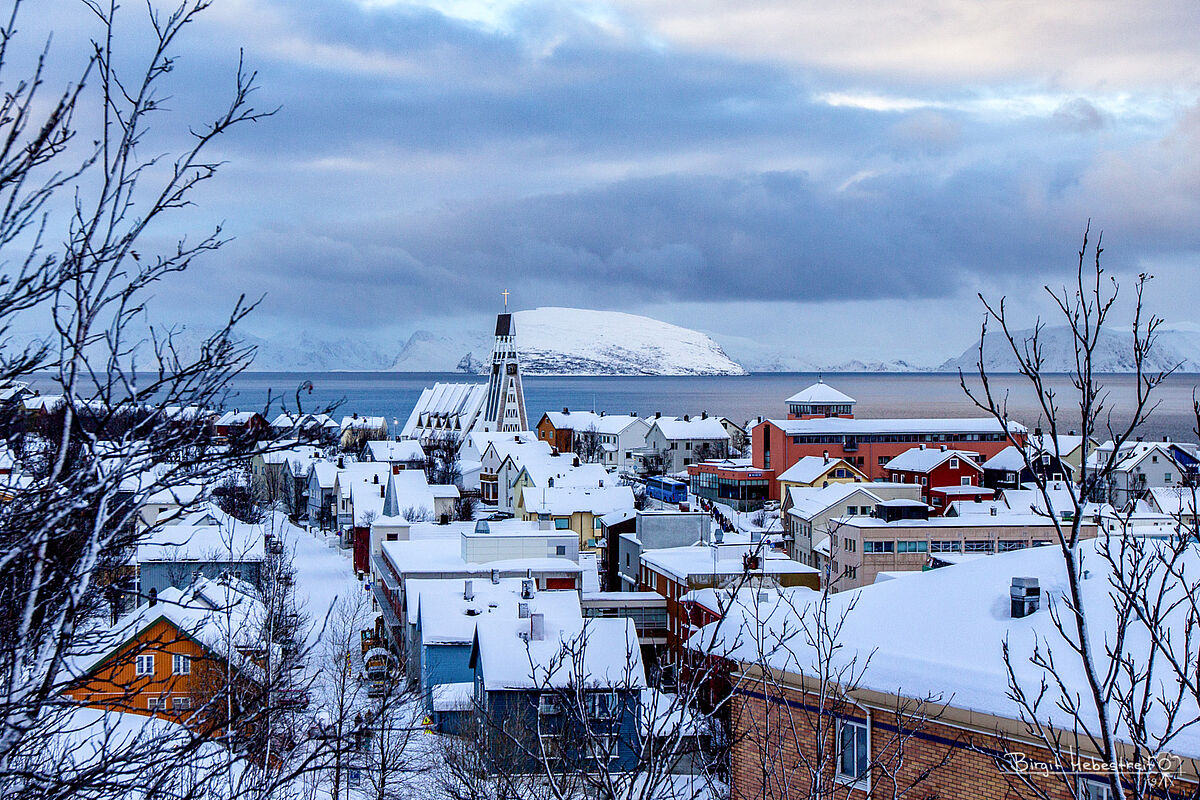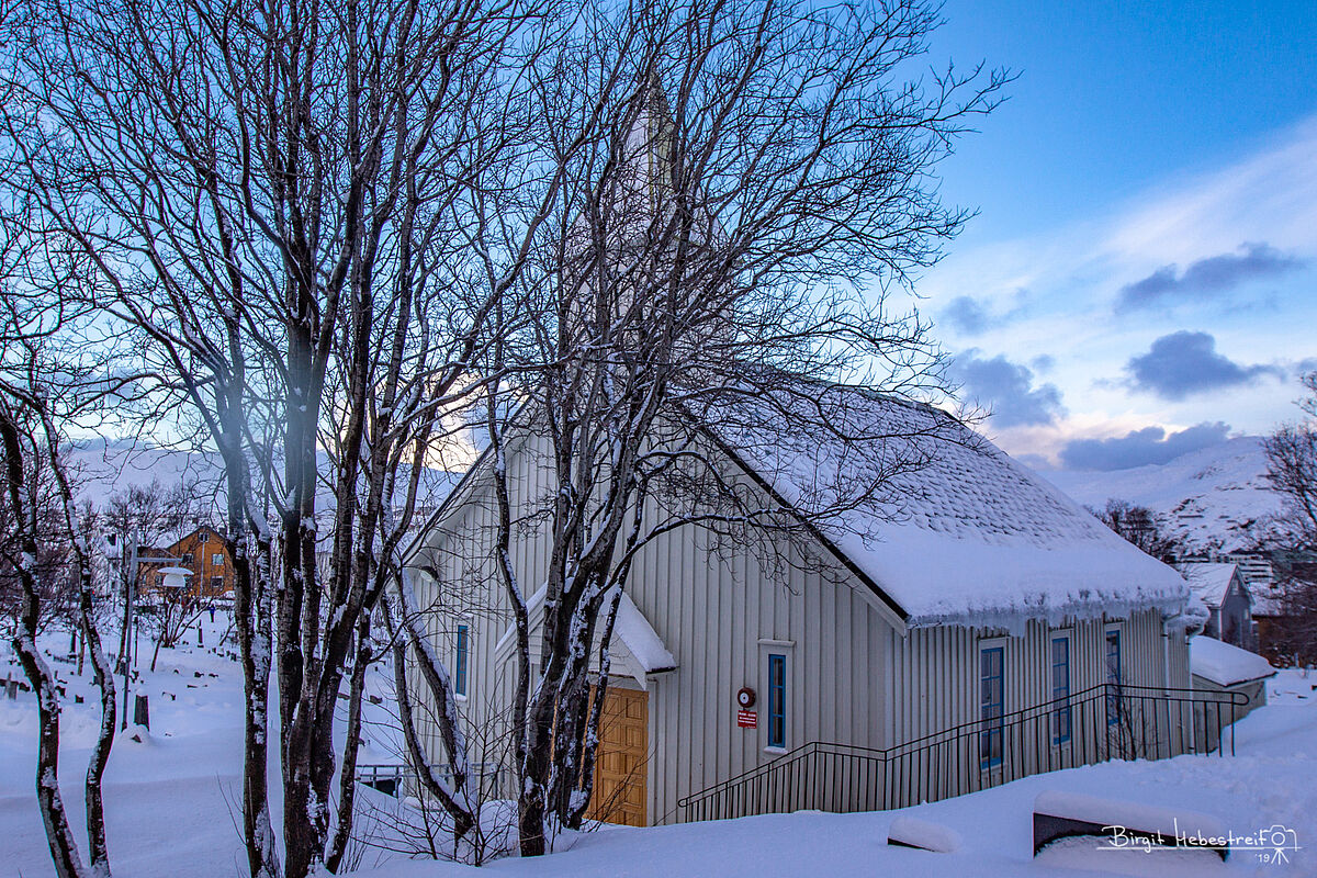 Es bleibt der Fußweg zur architektonisch beeindruckenden Hammerfestkirche von 1961 und dem gegenüberliegenden, tief verschneiten Friedhof mit der Grabkapelle, die als einziges Gebäude von der Zerstörung beim Rückzug deutscher Truppen im 2. Weltkrieg verschont wurde. Auf dem Rückweg noch die üblichen Hammerfestfotos und ein Blick in den Eisbärenklub, dann legt die Nordlys ab und noch im Sund zieht sich die Wetterküche zusammen.