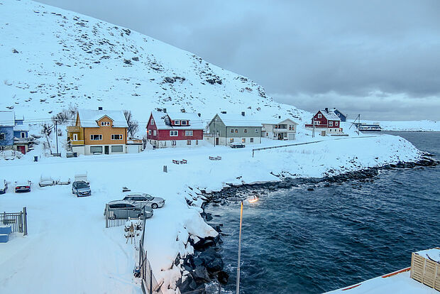 Den ersten Anlegeort am beginnenden Tag hat Birgit nicht erlebt, der Bericht des Vortages war wieder erst weit nach Mitternacht fertig. Havoysund hat mich auch zum zweiten Stopp fasziniert, als gegen 8.30 Uhr in den farbenfrohen Holzhäusern entlang der Küstenstraße noch das Licht zum Frühstück brannte. So konnte ich auch erreichen, dass ein Foto von mir (sicher das letzte) Aufnahme in den Blog gefunden hat.