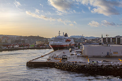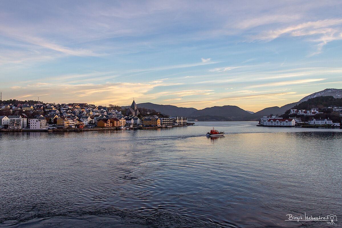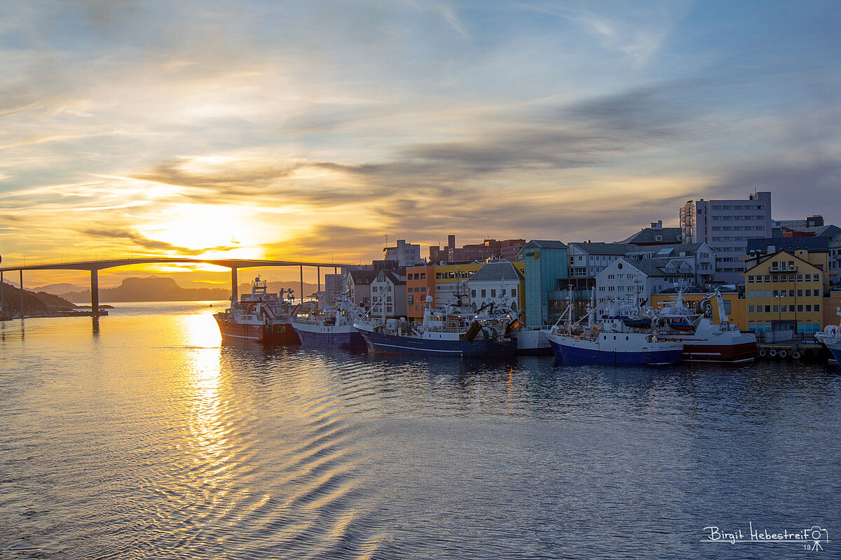 So wird die Zeit auch nicht lang bis wir um 16:30 Uhr Kristiansund anlaufen. Auf der Nordfahrt waren wir mitten in der Nacht hier und ich hatte bei Regenwetter nur kurz den Kopf aus der Tür gesteckt. Jetzt ist Sonnenuntergangszeit und die wunderschön gelegene Stadt gibt mit dem bunten Himmel zusammen herrliche Fotomotive.