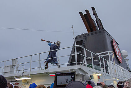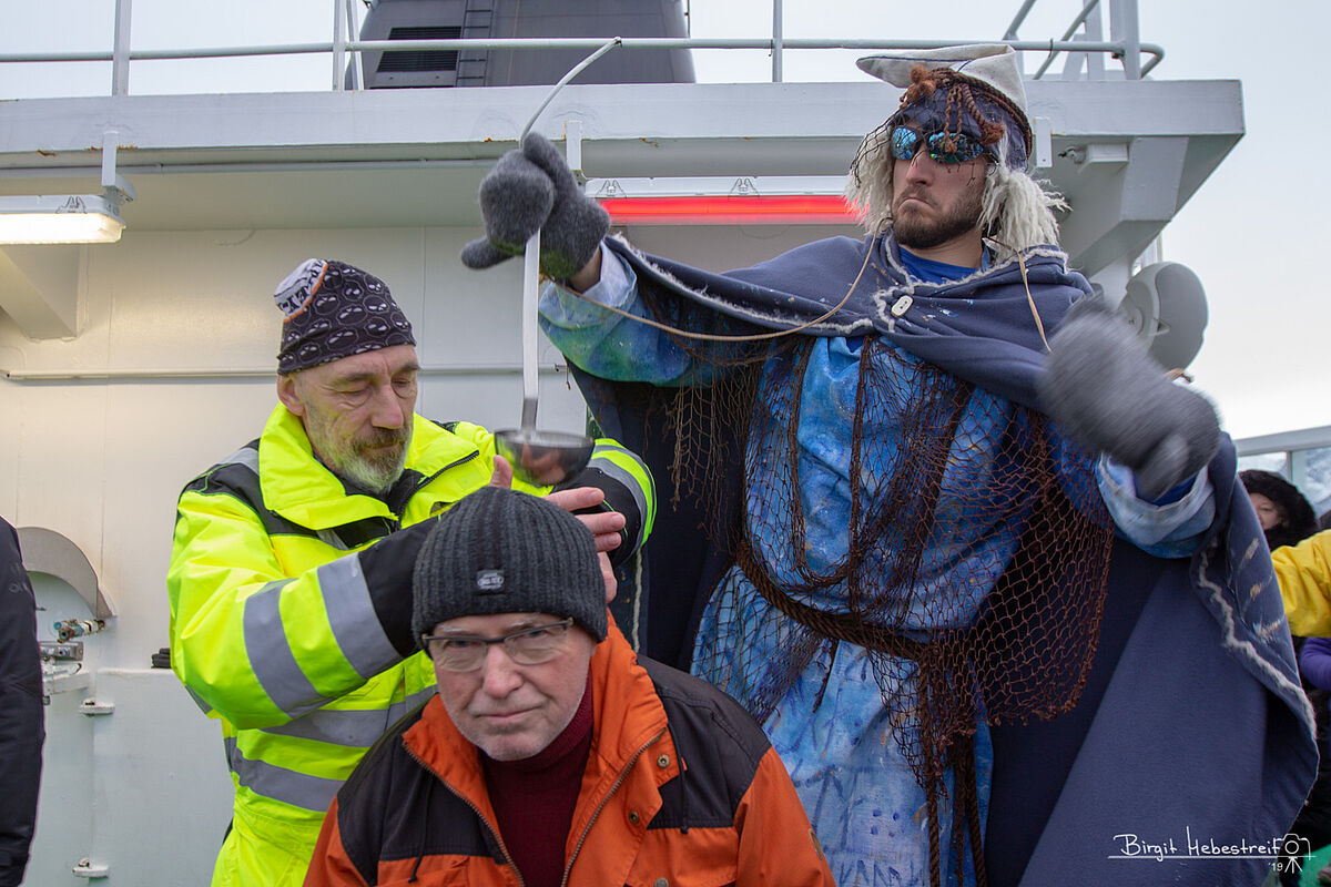 Vati dagegen sitzt um sieben im Frühstücksraum und ist zur Überfahrt an Deck. So hat er sich auch die Polartaufe verdient, die Njørd an denen vornimmt, die zum ersten mal den Polarkreis überquert haben (und an denen, die sonst noch wollen).