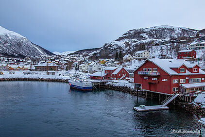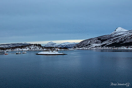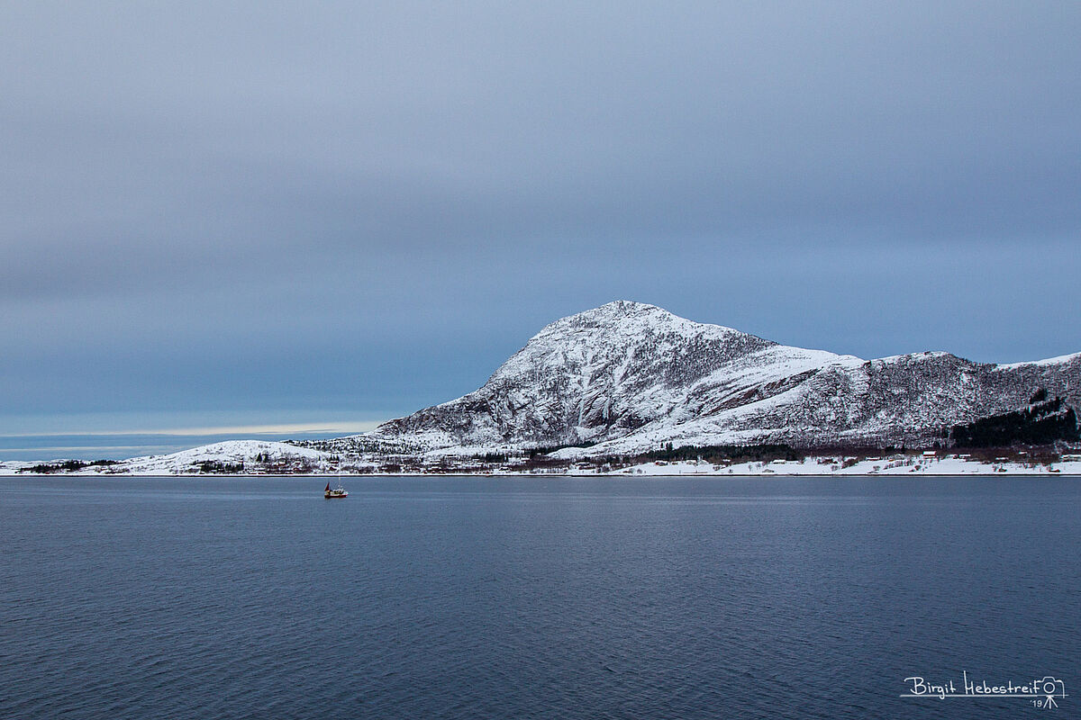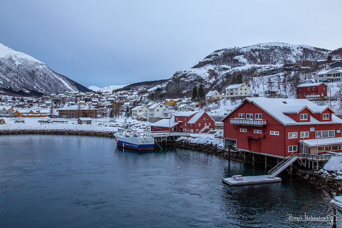 Spätestens vor Ørnes sollte man aber mit der Kamera an Deck stehen. Der kleine Hafen liegt wunderbar zwischen Bergen eingebettet - mit den weiß-gepuderten Berghängen ist das die perfekte Postkartenidylle.