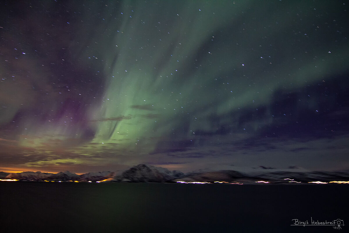 Die Polarlichter sind allerdings sehr großflächig und wenig intensiv. Und ich habe bei dem Sturm Probleme, das Stativ fest zu halten.