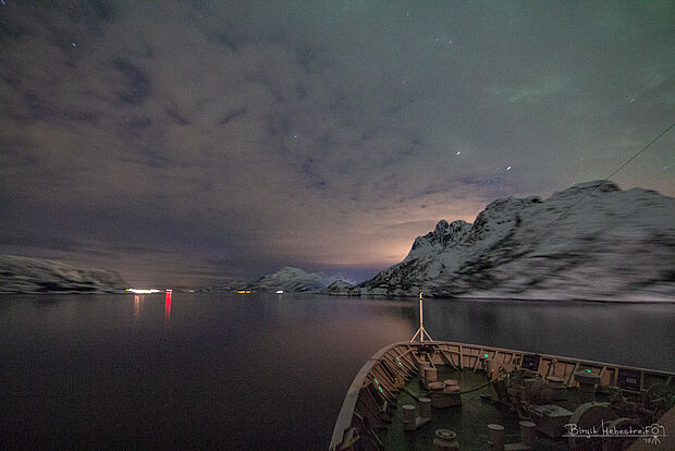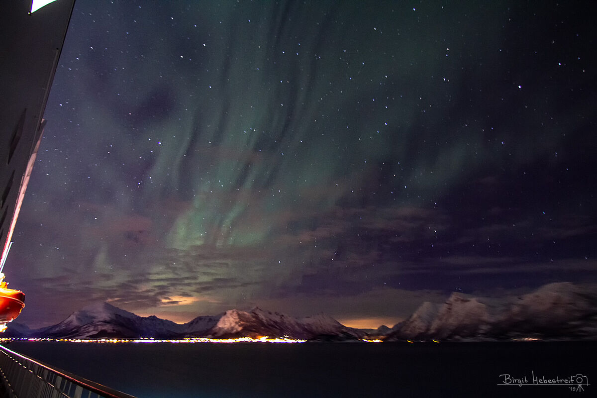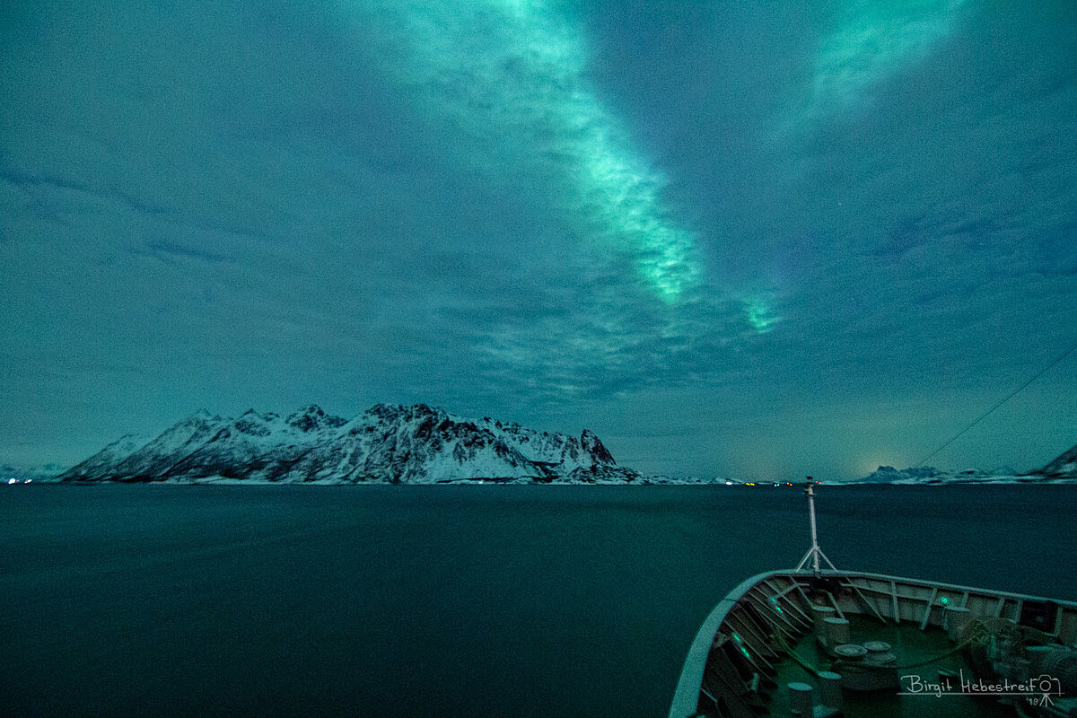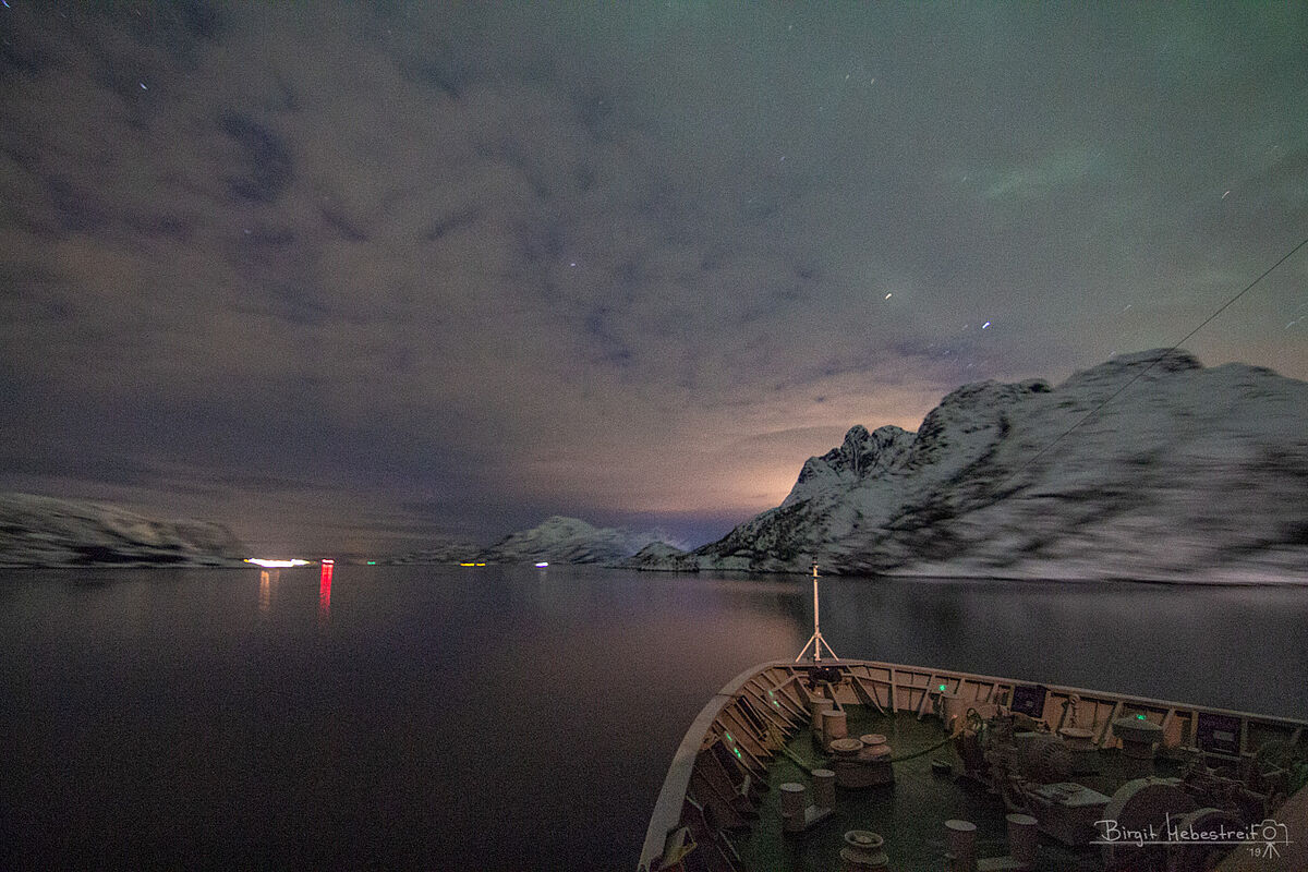 Vor allem, wenn wir am späten Abend weiter durch eine eindrucksvolle Landschaft im Raftsund fahren. Polarlicht wäre hier irre! Und um 23 Uhr fahren wir am Trollfjord vorbei, in den man im Winter leider wegen Lawinengefahr nicht einfahren kann.