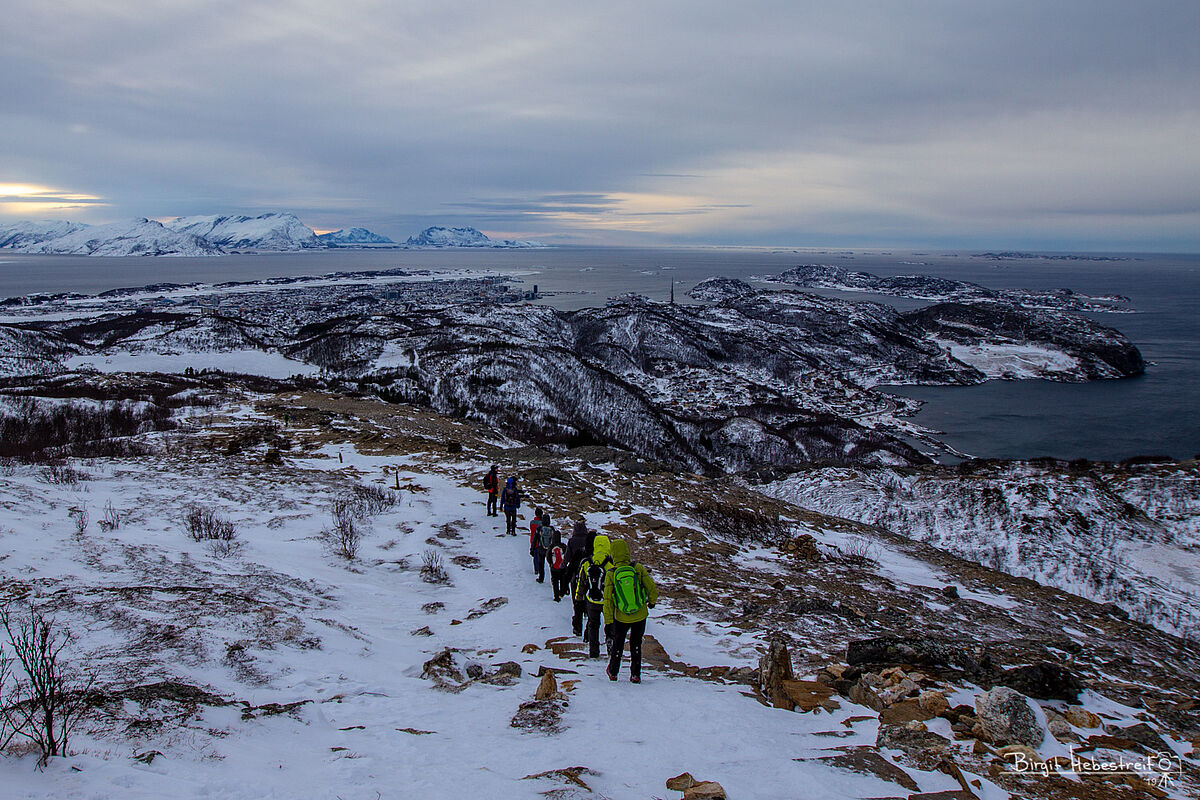 Wir brauchen wieder unsere Spikes. Von oben haben wir dann einen schönen Blick auf die Stadt, die Buchten der Umgebung und den größten Malstrom Europas. In der Ferne sieht man sogar die Lofotenwand, die wir heute Abend erreichen werden.