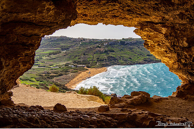 Auch aus der Höhle hat man einen wunderschönen Blick auf die Ramla Bay.