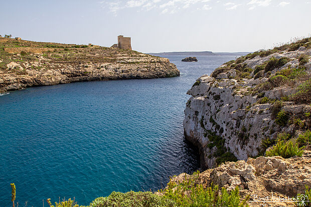 Nur wenige Kilometer westlich von Mgarr liegt der Badestrand Mgarr ix-Xini. Das ist unser erstes Ziel. Am Ende der langgezogenen Badebucht steht auch hier ein Wachturm, der zusammen mit der Bucht ein schönes Foto-Motiv abgibt.