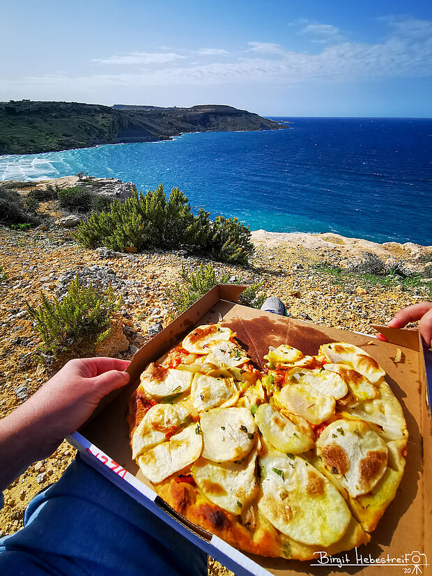 Eine Ftira aus Gozo ist eine Art deftig belegtes kross gebackenes Fladenbrot, ähnlich einer Pizza. Die oberste Schicht sind dünn geschnittene Kartoffeln, was das ganze Gebäck sehr saftig macht. |