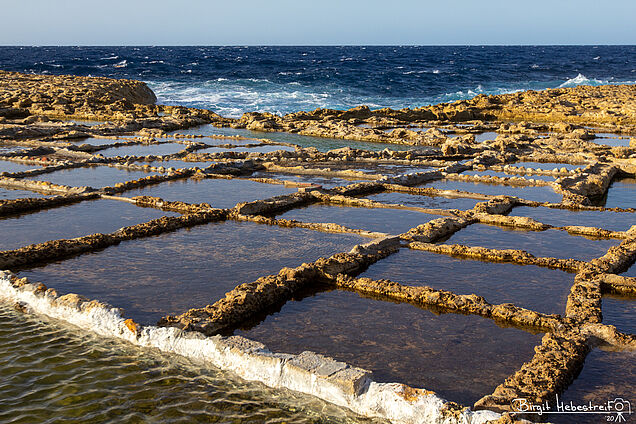 An der Nordküste der maltesischen Insel Gozo befinden sich die Salzpfannen von Xwejni Bay. Die im unregelmäßigen Schachbrettmuster angeordneten 350 Jahre alten Salzbecken erstrecken sich über eine Länge von etwa 3 km die Küste entlang. Hier wird seit der Römerzeit Salz gewonnen, heute sind noch circa 300 Salinen in Betrieb, die zwischen Mai und September bewirtschaftet werden. Dann kann man beobachten, wie die Einheimischen auf traditionelle Weise das Salz zusammen kehren. |