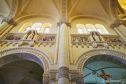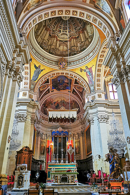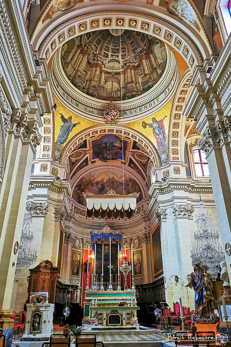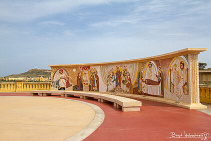 Da sie nicht in einer Ortschaft steht, ist sie weithin zu sehen. Auf den Platz vor der Kirche befinden sich, genau wie im Inneren, Mosaike. Drinnen ist die Kirche modern und hell. Sie unterscheidet sich sehr von den anderen Kirchen, die ich bisher auf Malta besucht habe.