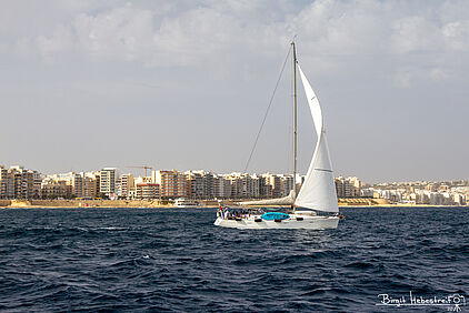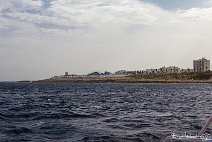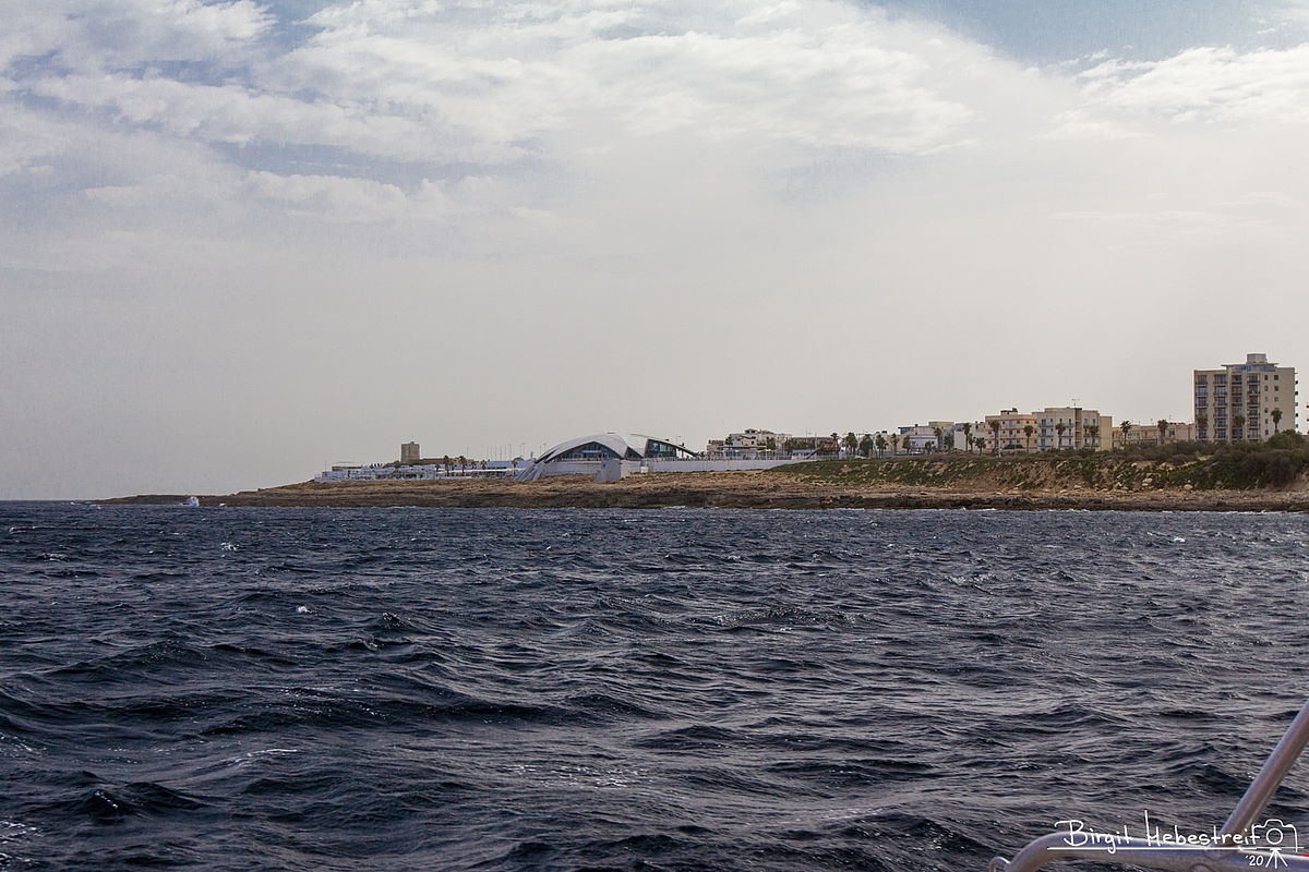 Wir haben keine Lust auf Innenraum und Maske. Deshalb sitzen vorne draußen auch wenn es sehr windig ist. Die Fahrt geht entlang der Nordküste. In Sliema und St. Julians sieht man die Betonburgen. Schön ist etwas anderes ... Nach einer halben Stunde sind wir in Bugibba - und nehmen noch Leute auf.