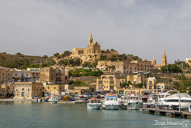 Im Hafen von Mgarr begrüßt uns weithin sichtbar die Church of the Madonna of Lourdes.