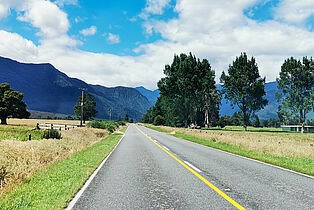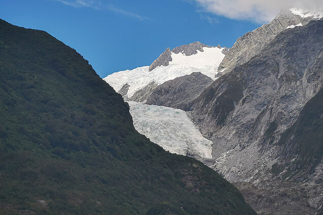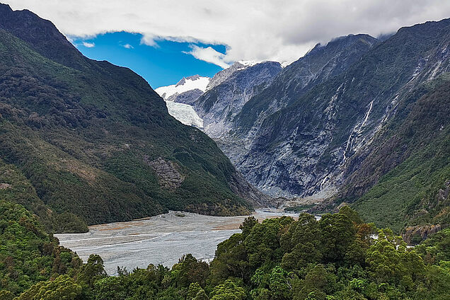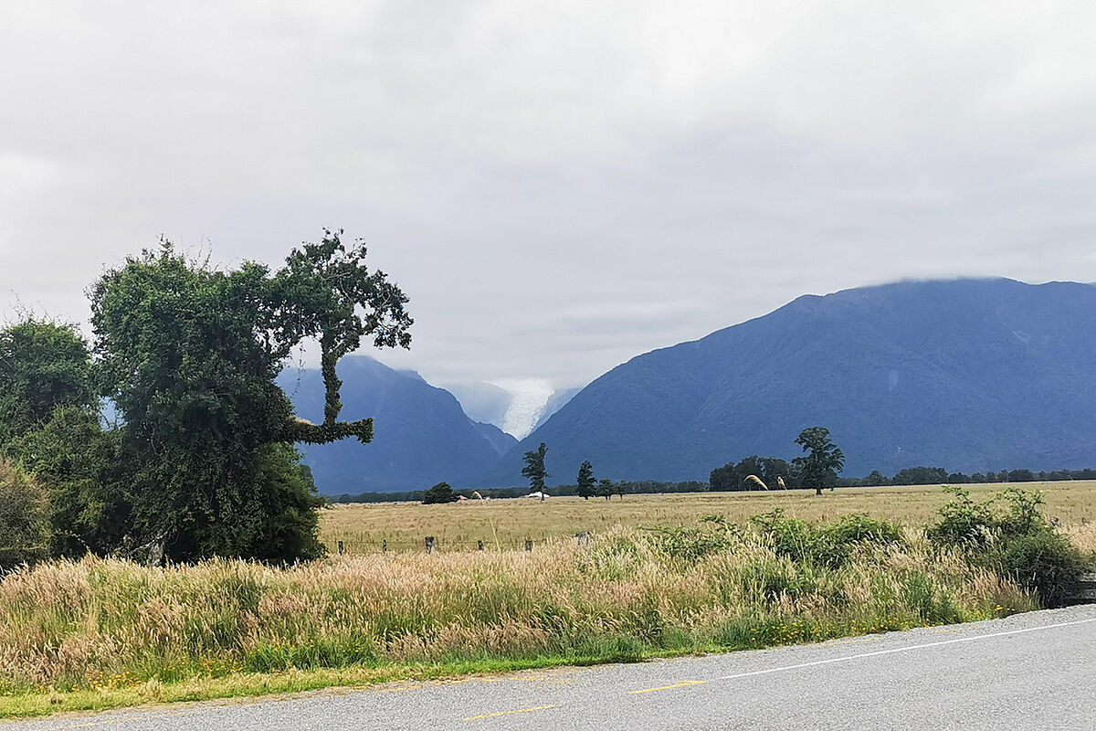 In der Ortschaft am Gletscher biegen wir zum See ab, entscheiden uns dann aber, für heute lieber einen Standplatz zu suchen. Wir sind genug gefahren und auch etwas müde. Von Ferne gucken wir aber schon mal auf den Fox-Gletscher.