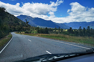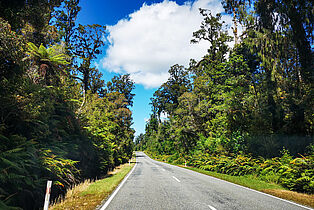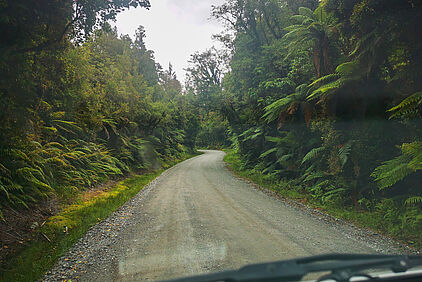 Nachdem wir den Hokitika River überquert haben, ändert sich die Landschaft. Wir fahren durch richtigen Urwald. Links und rechts Dickicht, dazwischen ein geteerter State Highway.