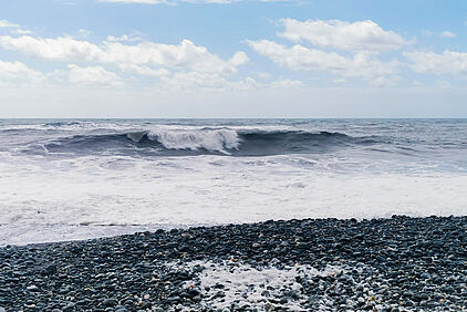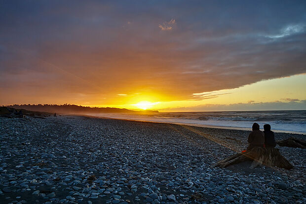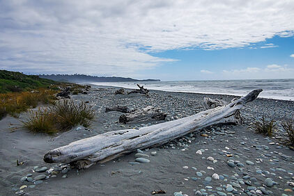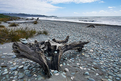 An Gillespies Beach gibt es einige Relikte aus der Goldgräberzeit. Einen alten Friedhof, eine alte Dredge, … Aber wir spazieren nur über den Strand und schauen bei einer steifen Briese den Wellen zu, wie sie ans Ufer knallen. Es ist ein Sand- und Steinstrand, an dem viele Bäume und Wurzeln angespült worden sind.