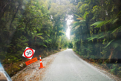 Die Entscheidung fällt zugunsten von Gillespies Beach. Dorthin führt eine kleine 20 km lange Straße, die 11 km als Schotterstraße durch den Urwald führt. Hier gibt es kein Netz mehr und der Wald ist so dicht, dass man nur mit einer Machete durchkommen würde. Liegenbleiben wäre hier nicht so gut.