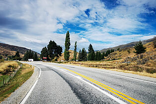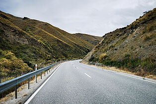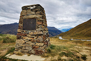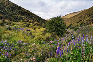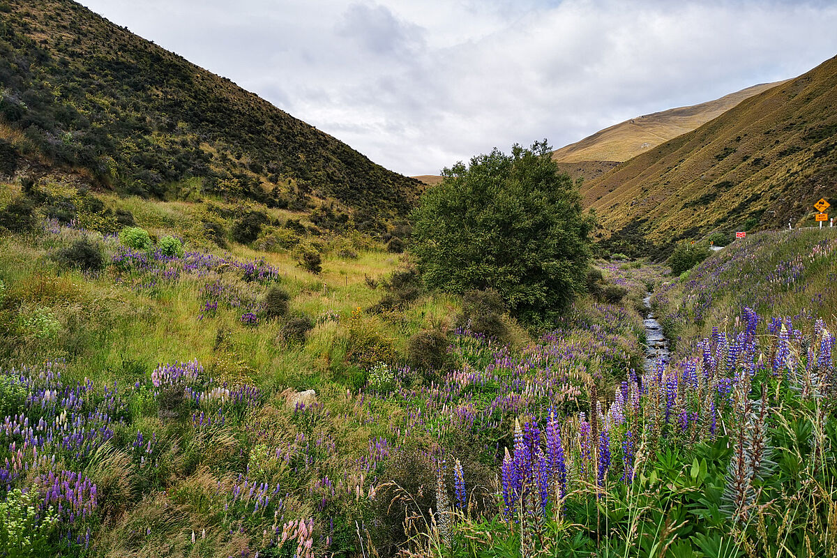 Um zehn geht es dann auf die Strecke. Wir nehmen die landschaftlich schönere Strecke über den Crown Range Summit in Richtung Queenstown. Der Pass ist mit 1026m der höchste geteerte Pass in Neuseeland. Landschaftlich ist die Strecke sehr schön. Kahle Berghänge mit lustigen Tussock-Graspuscheln und bunten Lupinen am Straßenrand. Das läd wieder zu Fotostopps ein.