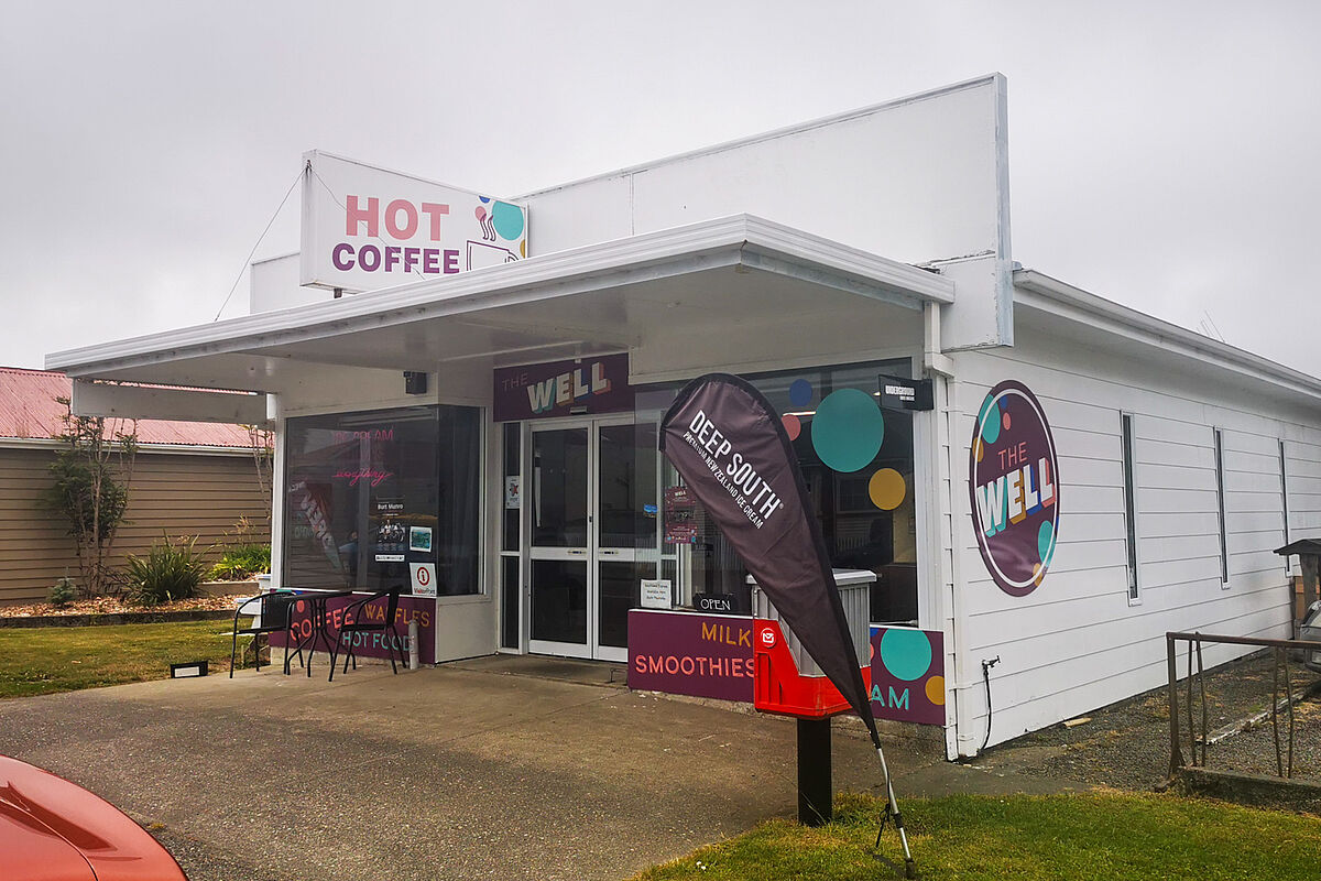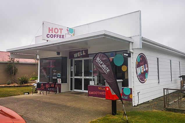 Dann halten wir zum Tanken in Tuatapere. Gleich hinter der Tankstelle fällt uns ein offenes Café auf. Wir halten gleich wieder an.