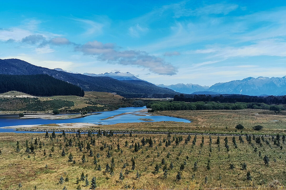 Ja, die Fotoapparate klicken wieder unterwegs auf der Straße. "The Land of the Long White Cloud" macht seinem Namen alle Ehre. Knapp unter den Bergspitzen zieht sich eine dünne Wolkenschicht über den ganzen Himmel.