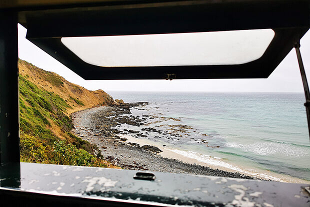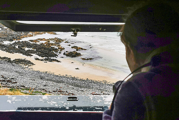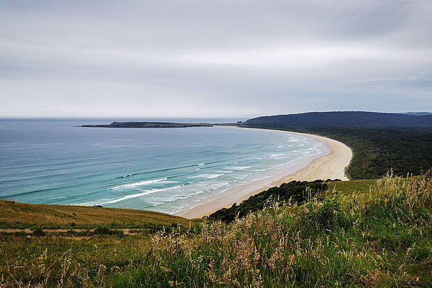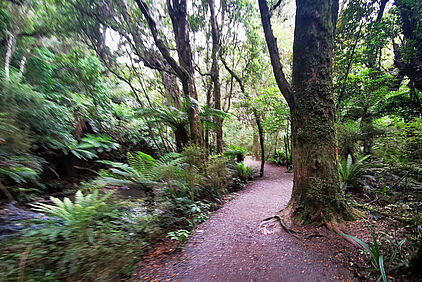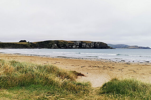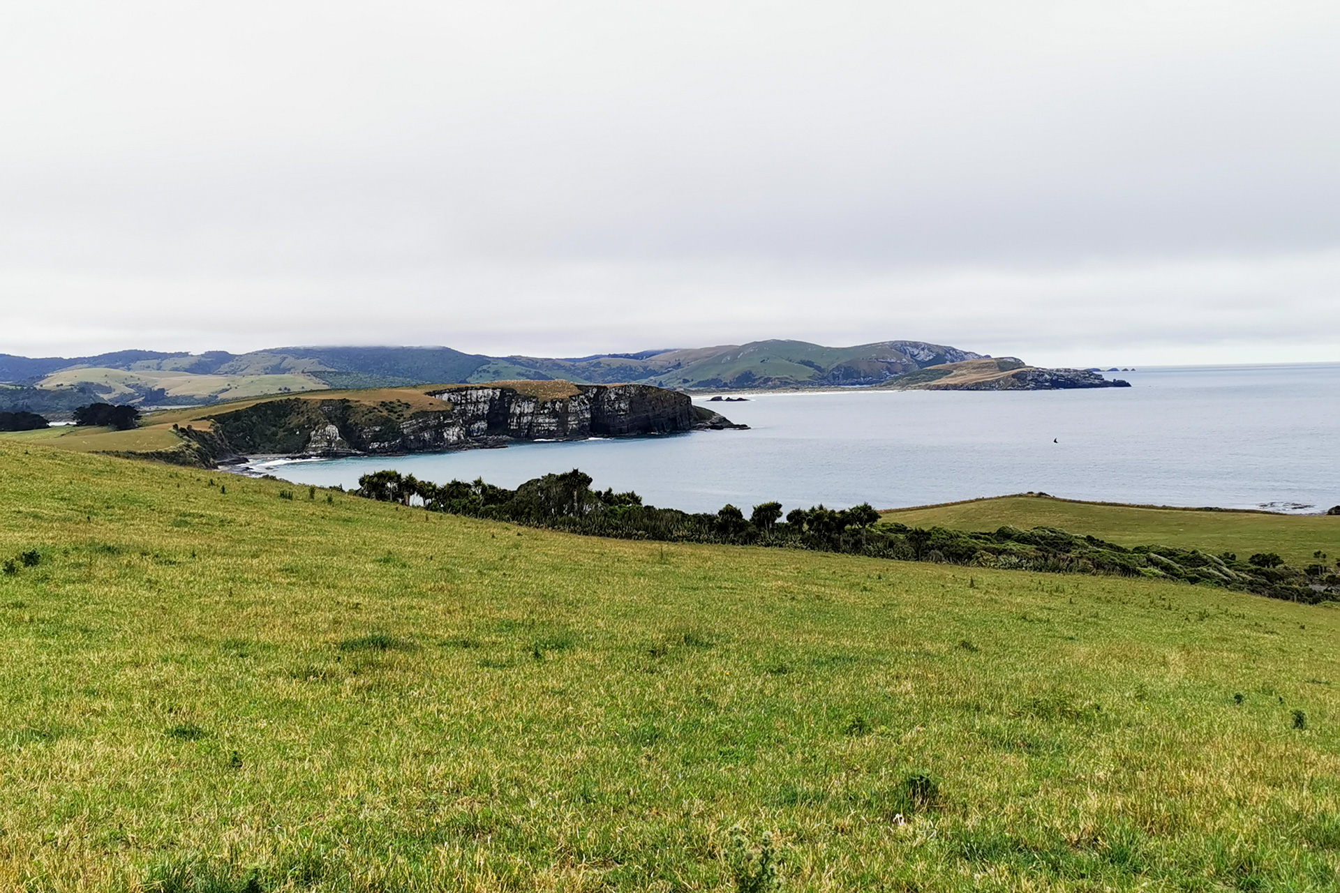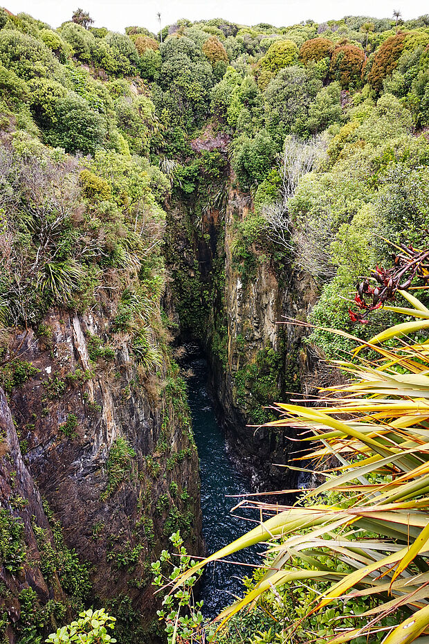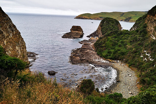 Dann geht es zu Jacks Bay. Von dort führt ein 20 Minuten Wanderweg zu Jacks Blowhole, einem 55m tiefen Loch, dass über einen 200m langen Tunnel mit dem Meer verbunden ist. Das Loch ist relativ zugewachsen. Man kann nur von einer Seite hinein schauen, aber man hat Wasser gesehen.