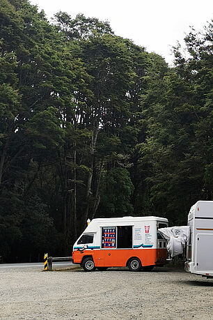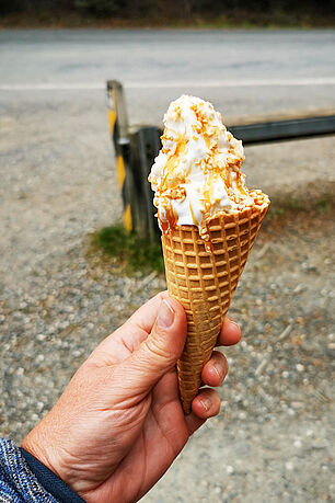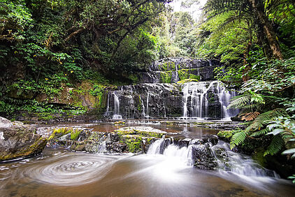 Zu den Purakanui-Falls möchte ich aber schon gern. Wir fahren die Schotterstraße bis zum Parkplatz. Dort steht ein Eiswagen im Nirgendwo. Natürlich können wir da nicht daran vorbei. Da es lange nicht geregnet hat (worüber wir uns natürlich überhaupt nicht beschweren), ist wenig Wasser in den Fällen. Das gibt natürlich nicht so ein schönes Motiv ab. Aber natürlich fotografieren wir trotzdem.