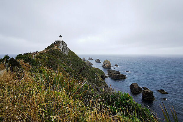 Besuchen wir erstmal Nugget Point Lighthouse. Eigentlich leuchten die vorgelagerten Felsen in der Abendsonne. Daher kommt auch der Name. Heute aber nicht. Es ist alles bewölkt. Keine Spur von Sonne. Robben liegen auf den Felsen.