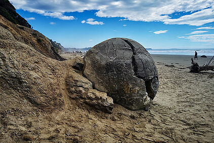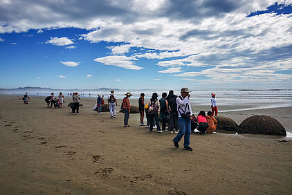 Ebbe ist 9:38 Uhr an den Moeraki-Boulders. Und nur bei Ebbe kann man sie sehen.