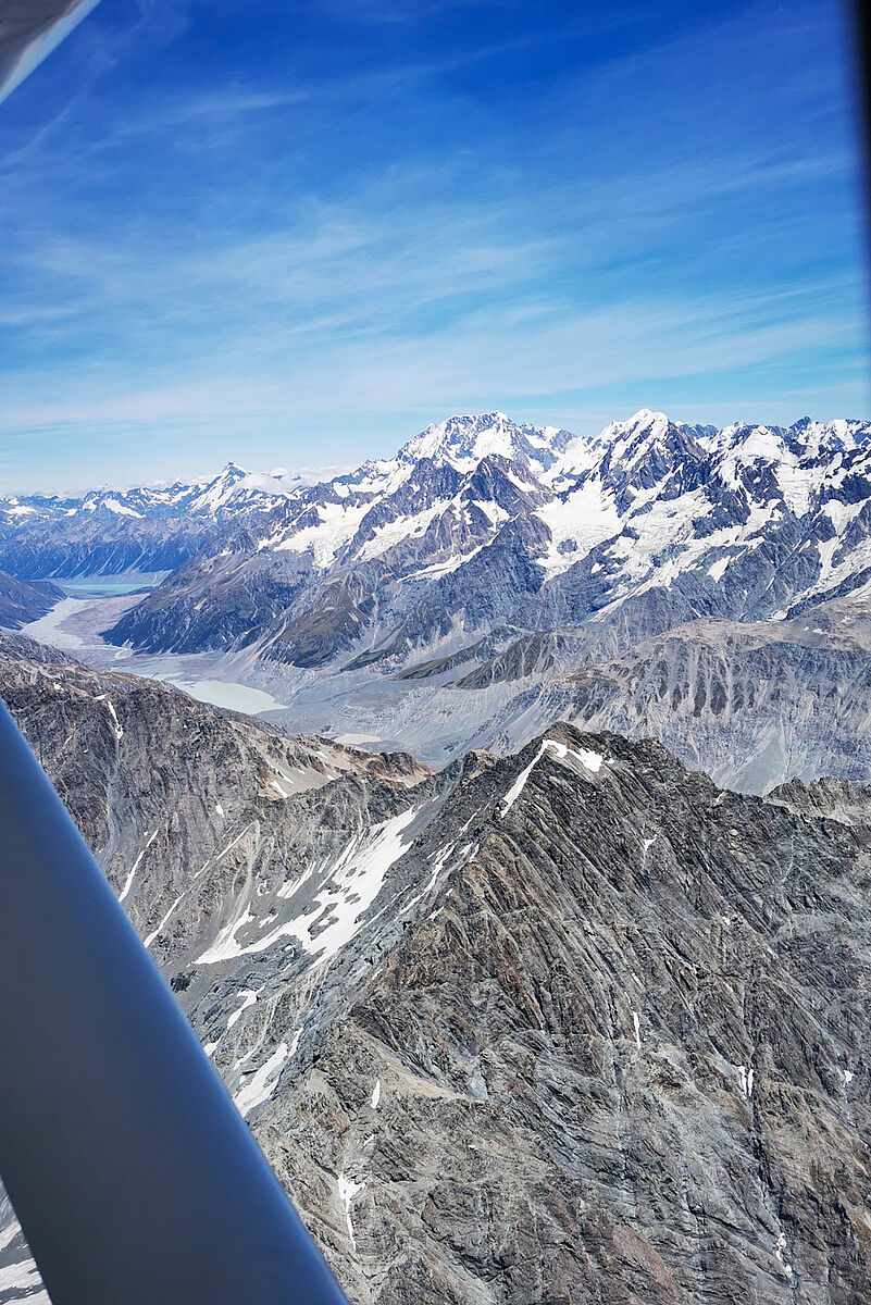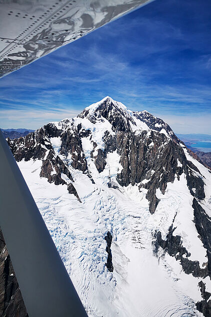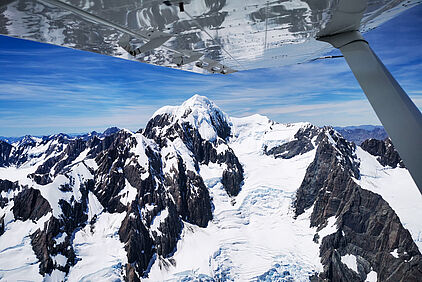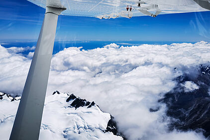 Unser Flug führt uns erst über den Lake Tekapo und den Lake Alexandria, dann den Godley-River und das Sibbald-Gebirge entlang bis zu den Gletschern. Wir sehen den Tasman-Gletscher, den Fox-Gletscher und den Franz Josef Gletscher. Über den Regenwäldern der Westküste liegt eine dichte Wolkendecke. Aber das Meer kann man wieder sehen.