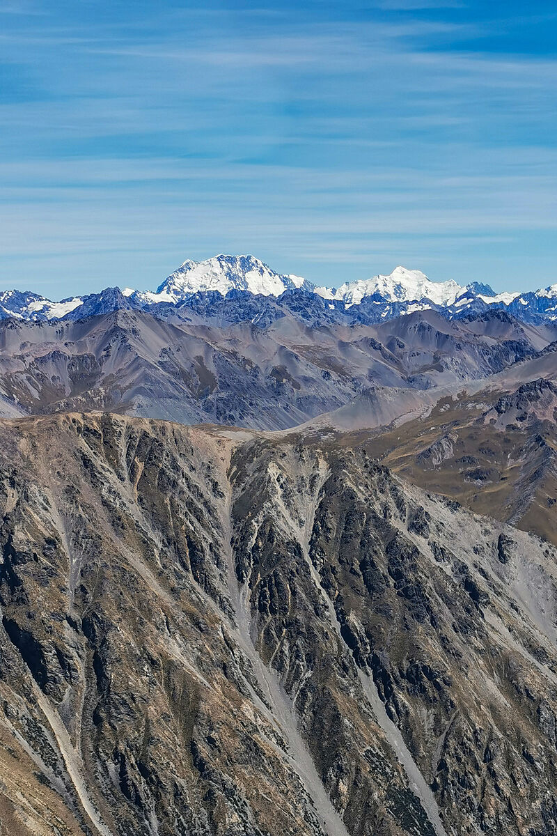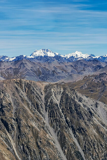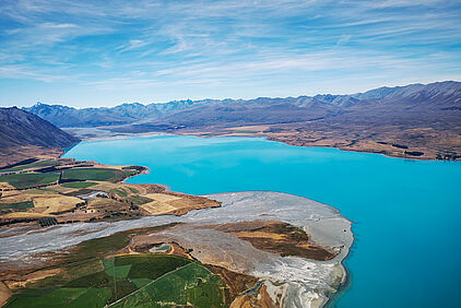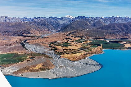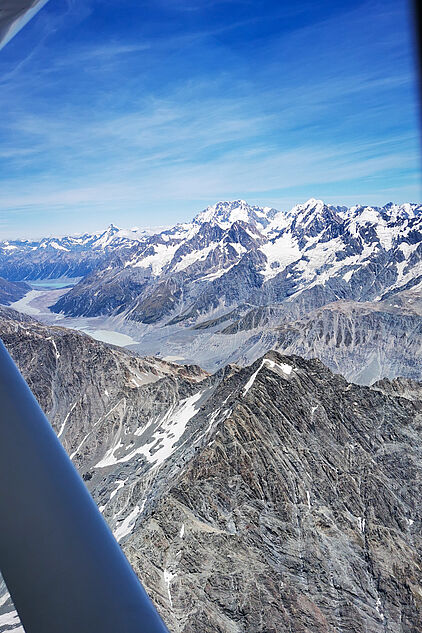 Dann geht es zum Mt. Tasman (3497m), zum Aoraki Mt. Cook (3754m) und zum Mt. La Perouse (3078m). Am Mt. Cook drehen wir eine Schleife, damit alle perfekt sehen können. Wir sehen den Lake Pukaki, der genauso schön blau ist wie der Lake Tekapo und kehren über die MacKenzie-Hochebene zurück mach Tekapo.