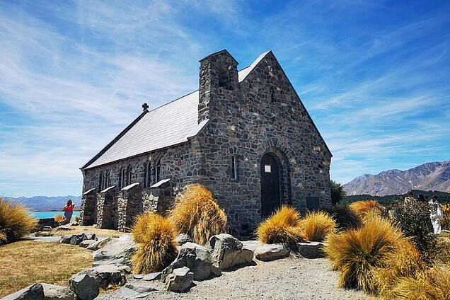 Der See ist wunderschön blau. Ich fotografiere noch die Church of the Good Shepherd, die "Kirche zum guten Hirten", die 1935 errichtet wurde und die wegen ihrer exponierten Lage sehr oft fotografiert wird.