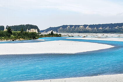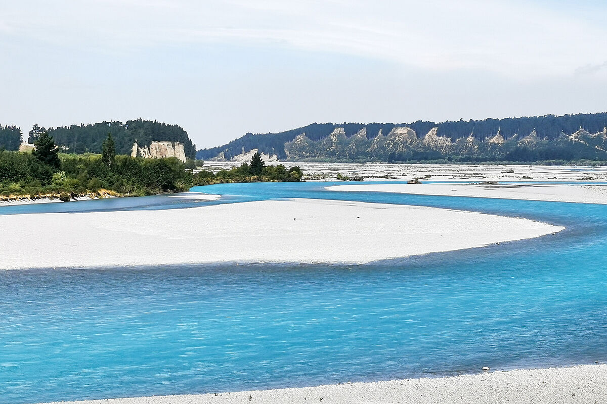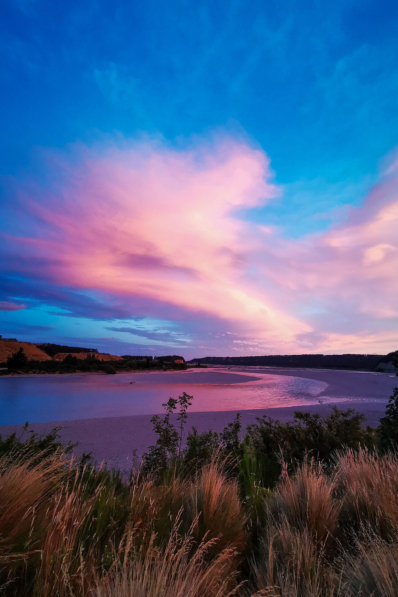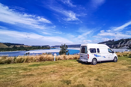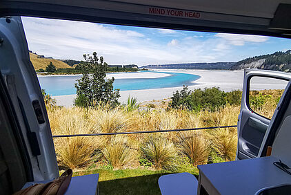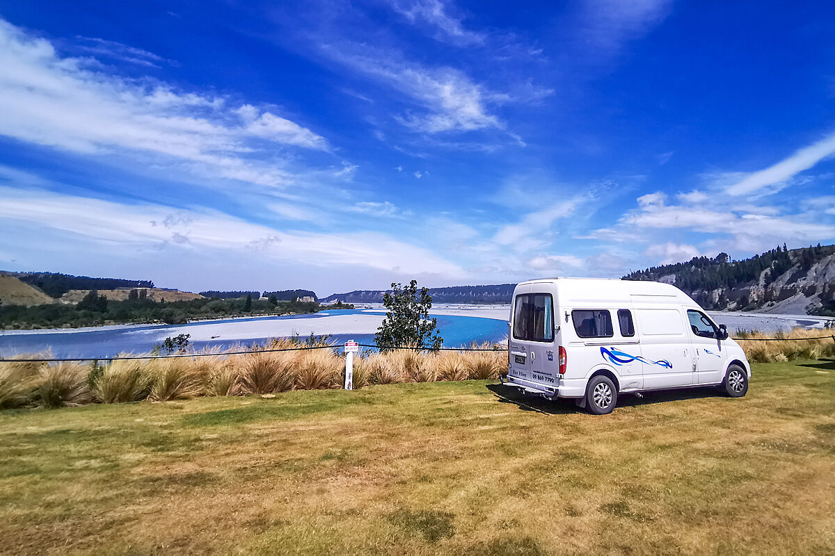 Wir sagen dem Campmanager, dass wir spontan angehalten haben, weil wir es hier so schön finden. Er freut sich und - wahrscheinlich etwas stolz - weist er uns den schönsten verfügbaren Platz zu. Wahnsinn! Wir haben einen wunderschönen Blick über den Rakaia River.