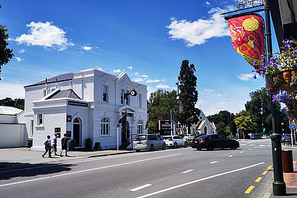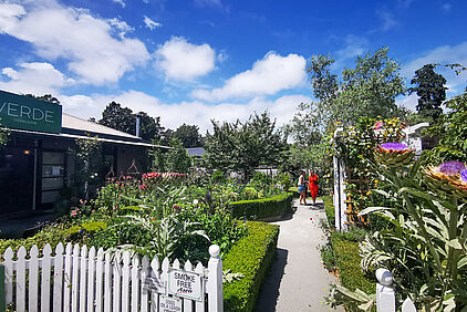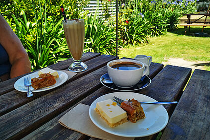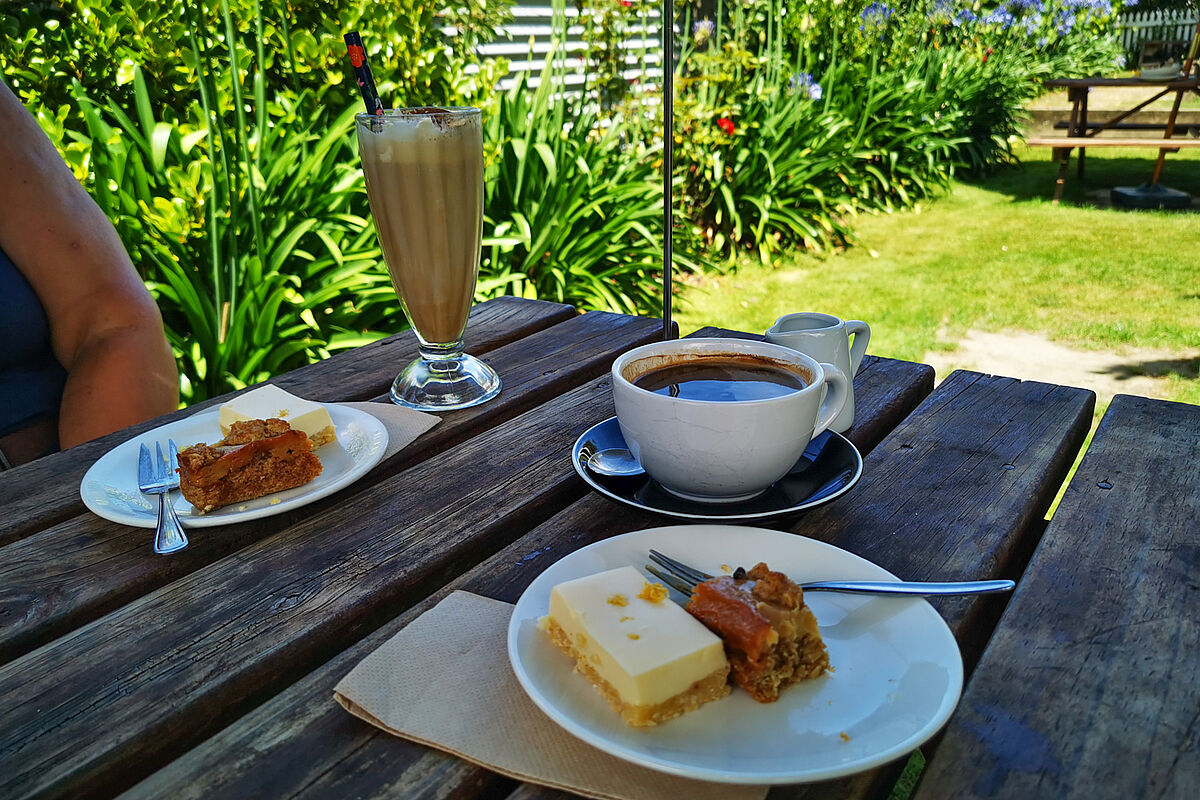 Wir halten erst in Geraldine, einem kleinen hübsches Künstlerdorf. Das ist ein guter Ort, um mal eine Pause einzulegen und einen Kaffee zu trinken. Wir waren im Café Verde, wo wir in einem sehr hübschen blühenden Garten sitzen konnten. Hier war das Wetter wieder richtig schön, Sonne, 24 Grad, windstill.